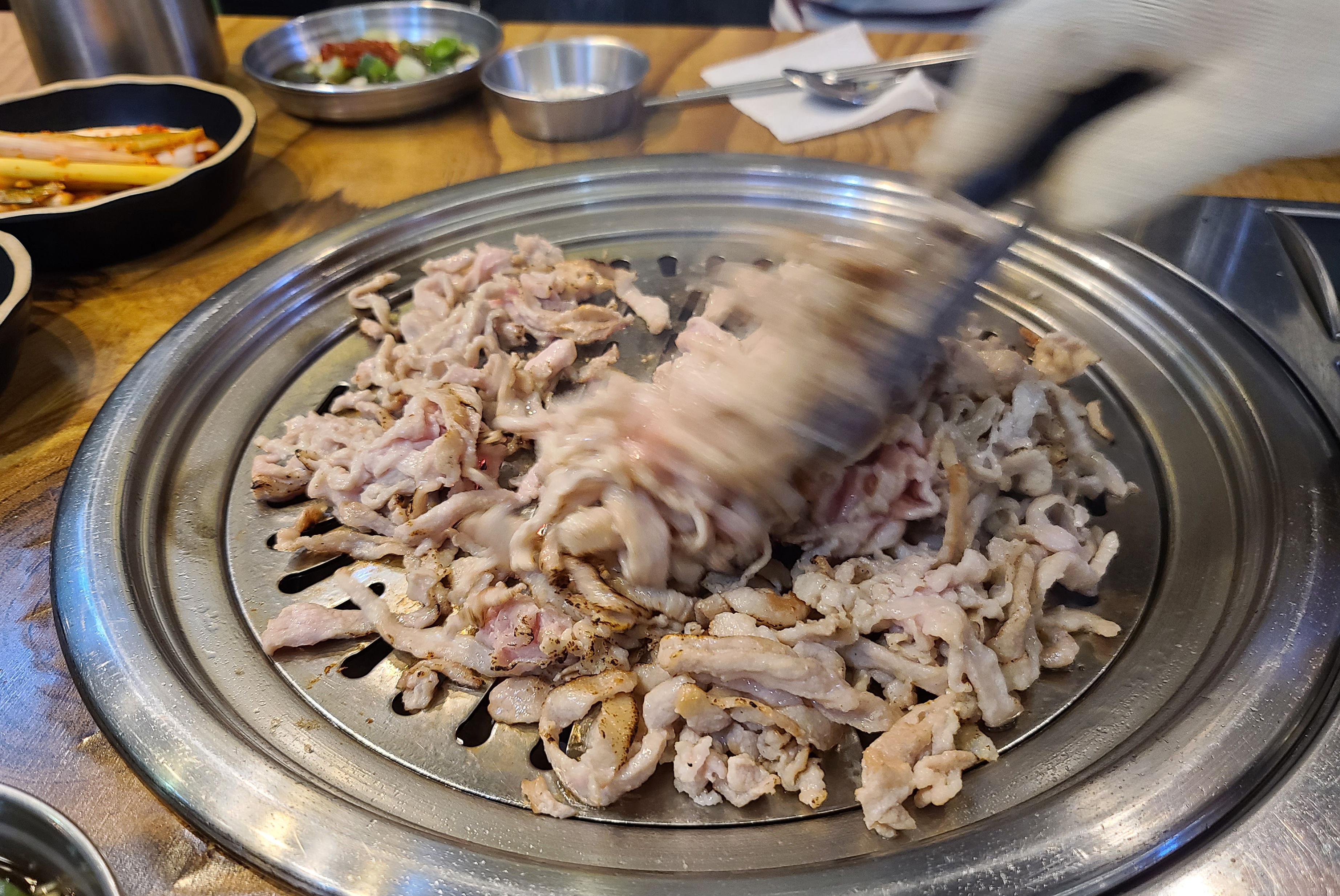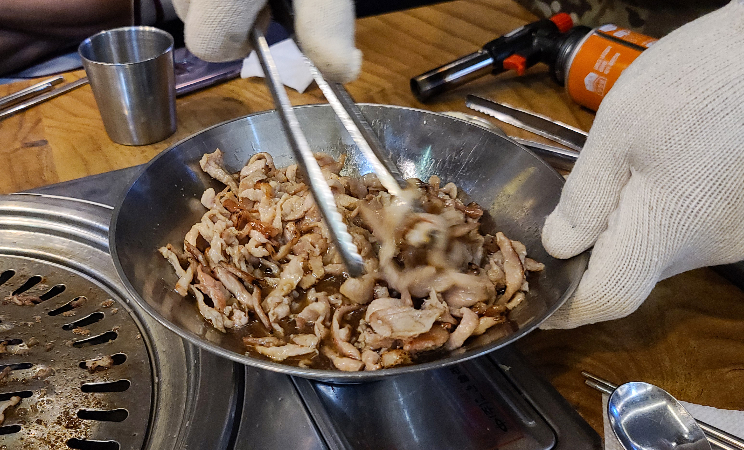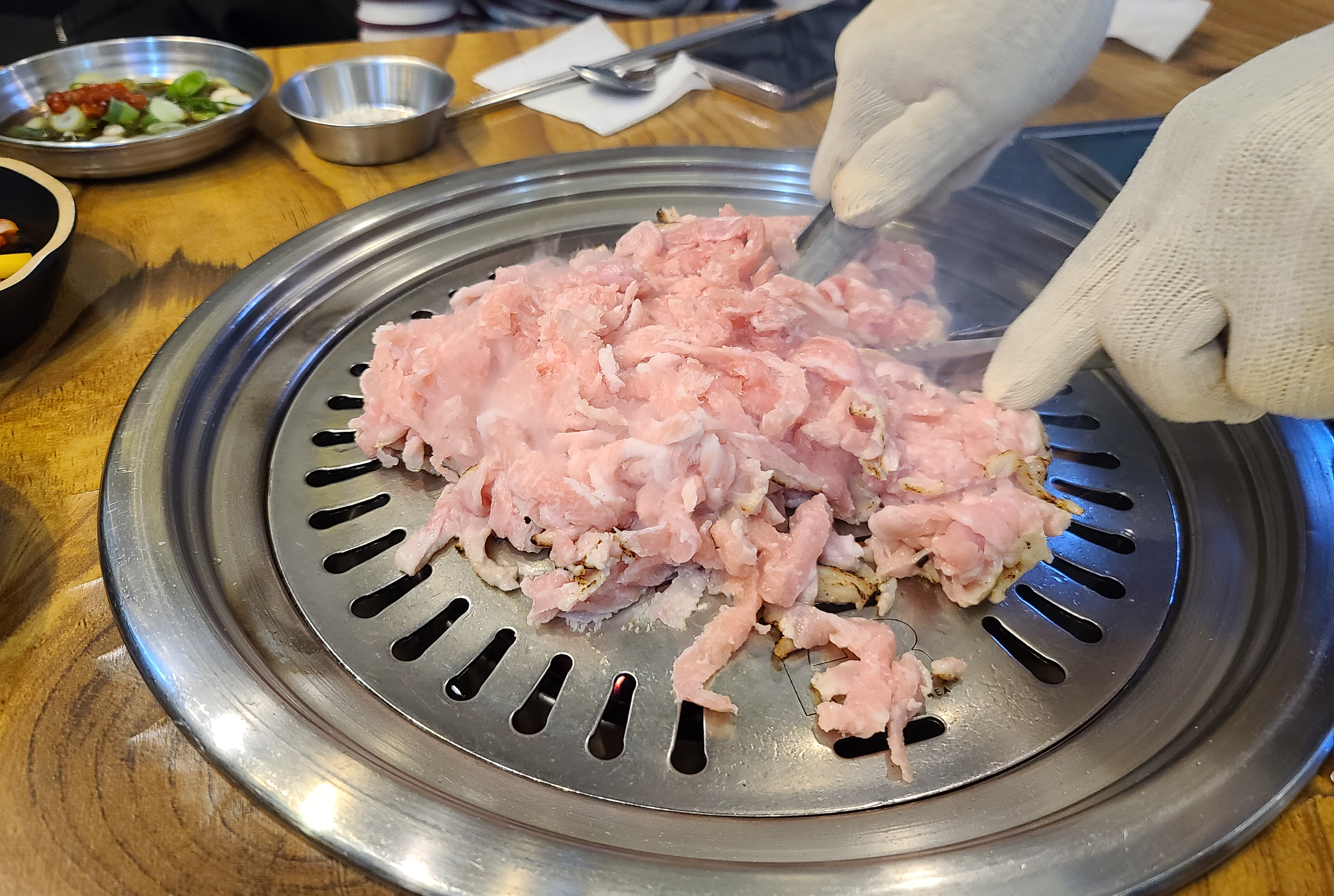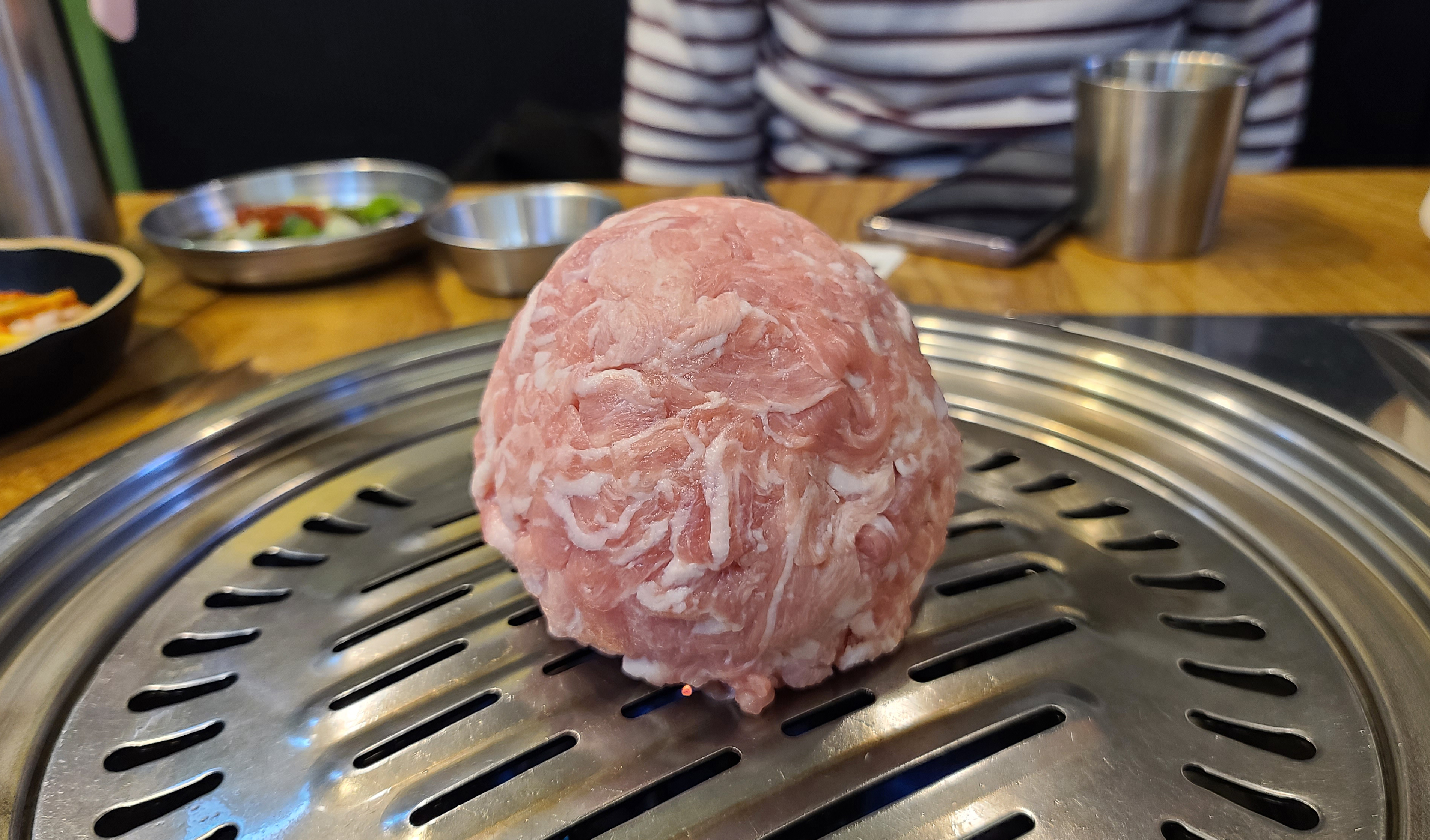 곧이어 기름기를 제거한 항정살 1근(600g) 짜리 슈퍼볼이 등장했습니다. 가격은 무려 55,000원으로 결코 저렴한 금액은 아니지만, 비주얼적으로도 맛으로도 부족함이 없었던 메뉴였습니다. 맨 처음에는 고기의 겉면을 익혀주다가 항정살을 헤쳐주어 속을 익혀주기 시작했습니다.