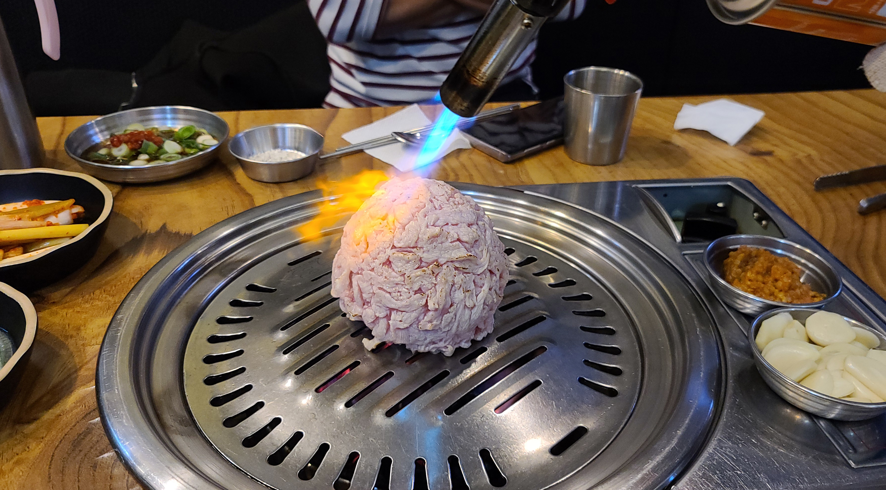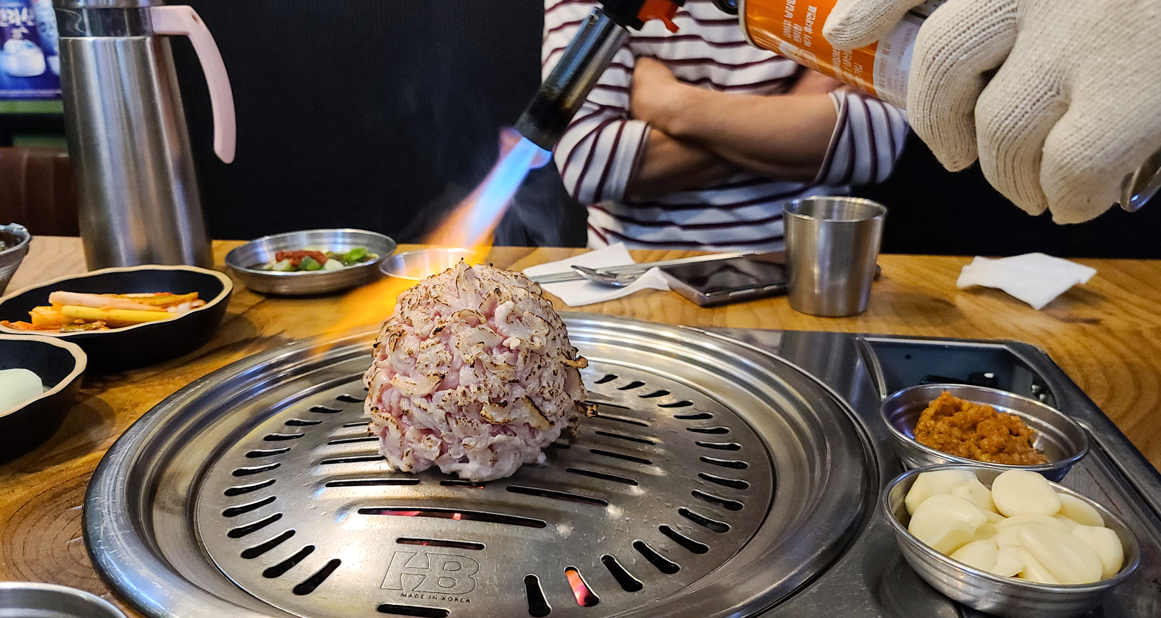 그중에 알려드릴 메뉴는 <팔월잔칫날>의 시그니처 메뉴인 '슈퍼볼'입니다. 광진구 팔월 잔칫날의 슈퍼볼은 항정살로 만든 공 모양의 메뉴인데요. 모양도 독특했지만 굽는 과정에서 감탄사를 연발할 수 밖에 없었던 메뉴였습니다.