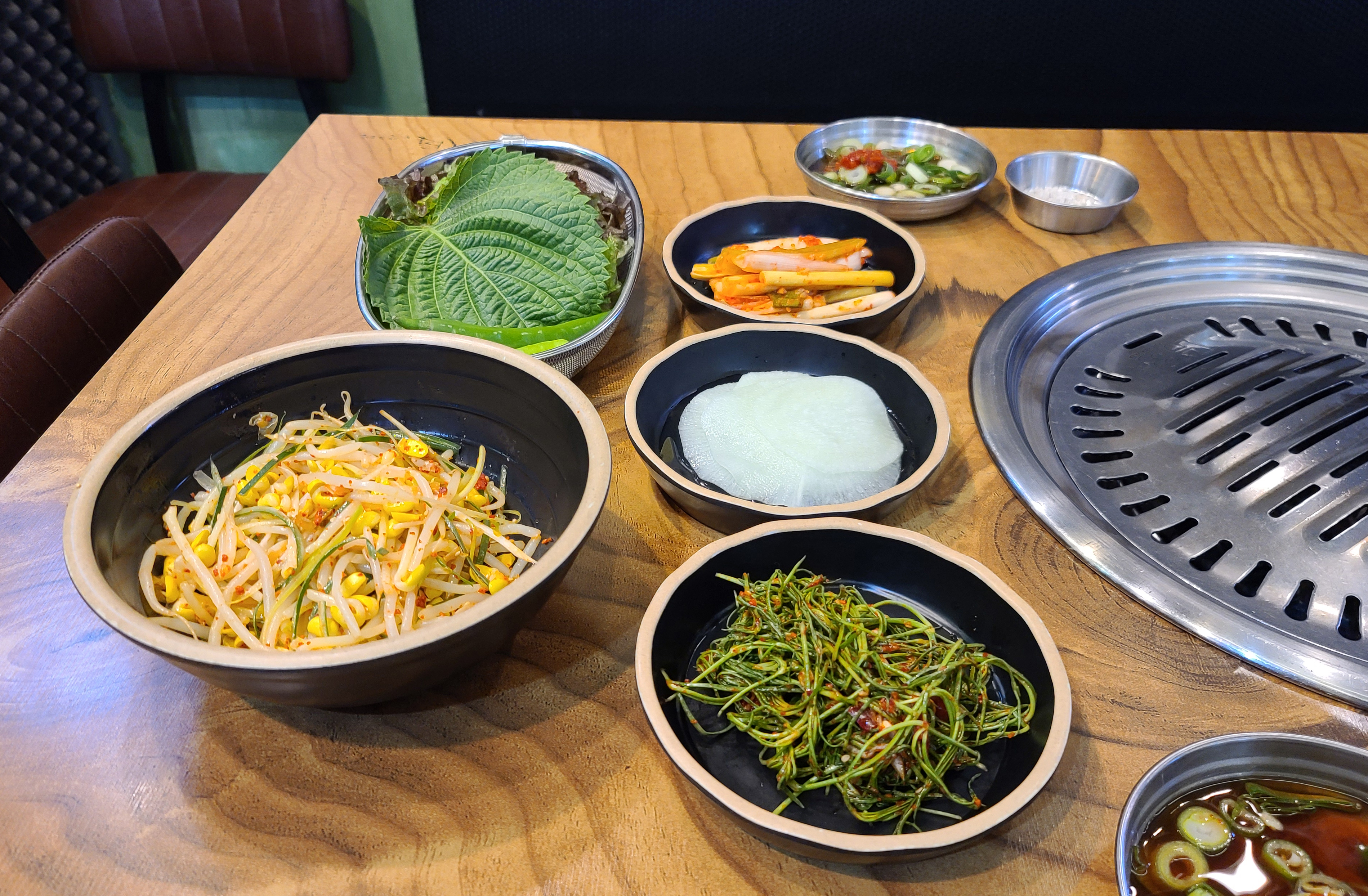 저희는 팔월 잔칫날의 하루 3판 한정 판매 메뉴인 '슈퍼볼'을 주문하였습니다. 다행히도 한정판매인 슈퍼볼을 제가 마지막으로 슈퍼볼을 주문할 수 있어서 맛볼 수 있었습니다. 밑반찬으로는 콩나물무침, 쌈채소, 파김치, 콩나물무침 등이 나왔습니다.