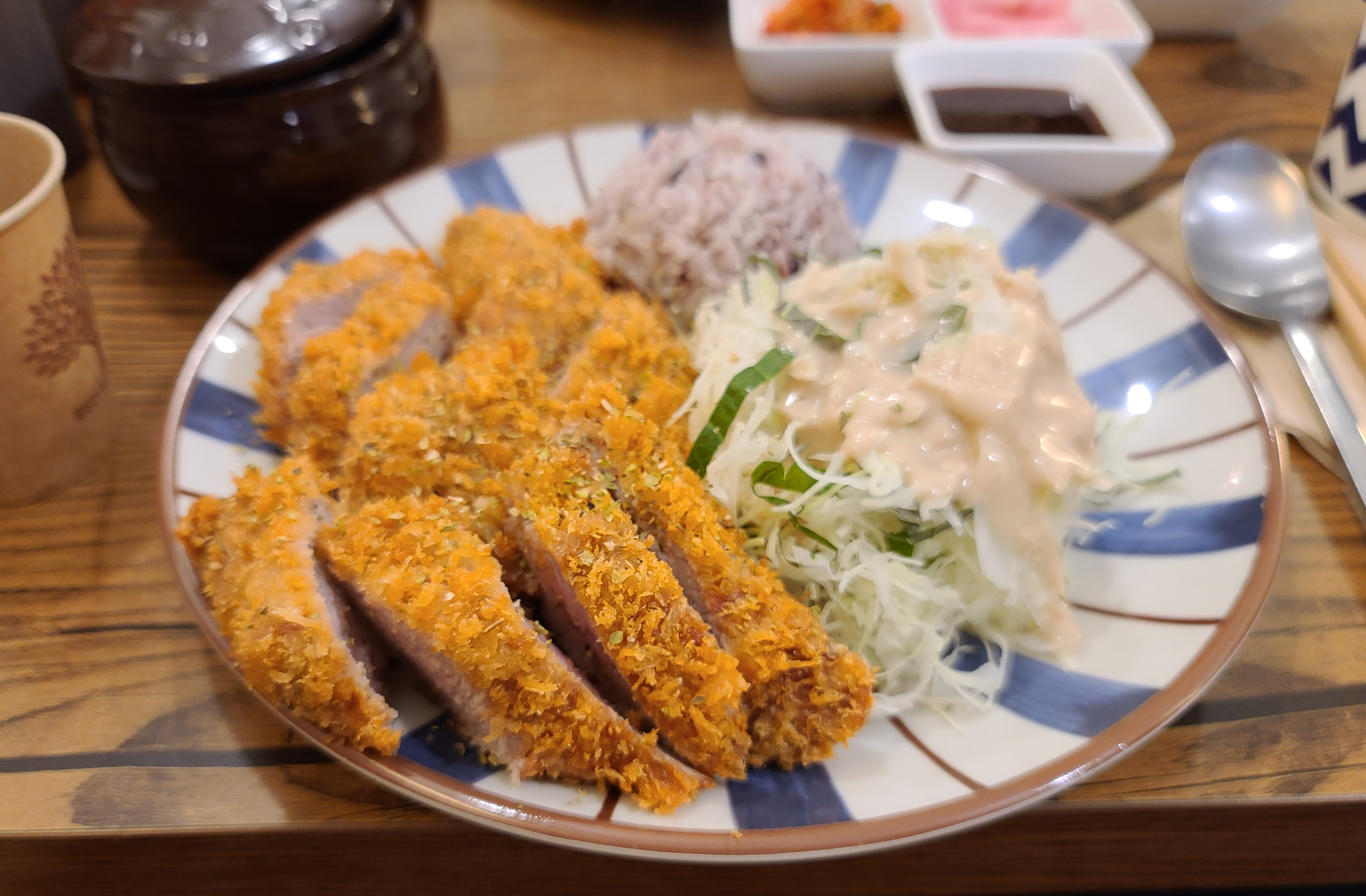 곧이어 주문한 돈까스가 나왔습니다. 곱빼기로 주문하였더니 기대했던 것만큼 넉넉한 양을 제공해주었습니다. 깻잎을 활용한 샐러드도 향이 좋았고 저에겐 밥도 양이 괜찮았습니다.