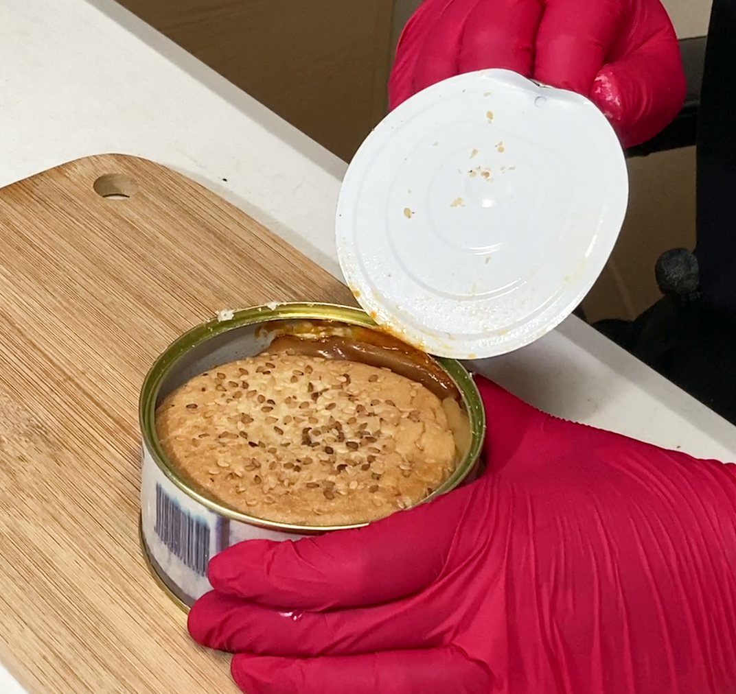 통조림 속 햄버거는 나름 참깨 빵과 고기 패티, 치즈가 들어가 우리가 흔히 생각하는 햄버거의 모습을 취하고 있었습니다. 가장 궁금했던 햄버거의 맛은 어땠을까요? 햄버거의 패티는 약간 두껍고 질긴 느낌이 있었습니다. 햄버거 맛은 편의점 햄버거와 비슷하거나 조금 못 한정도(?) 치즈의 향이나 고기 패티는 조금 저렴한 맛이 났는데, 호기심에 한 번 먹어볼 만 하지만 두 번은 먹고 싶지는 않은 맛이었습니다.