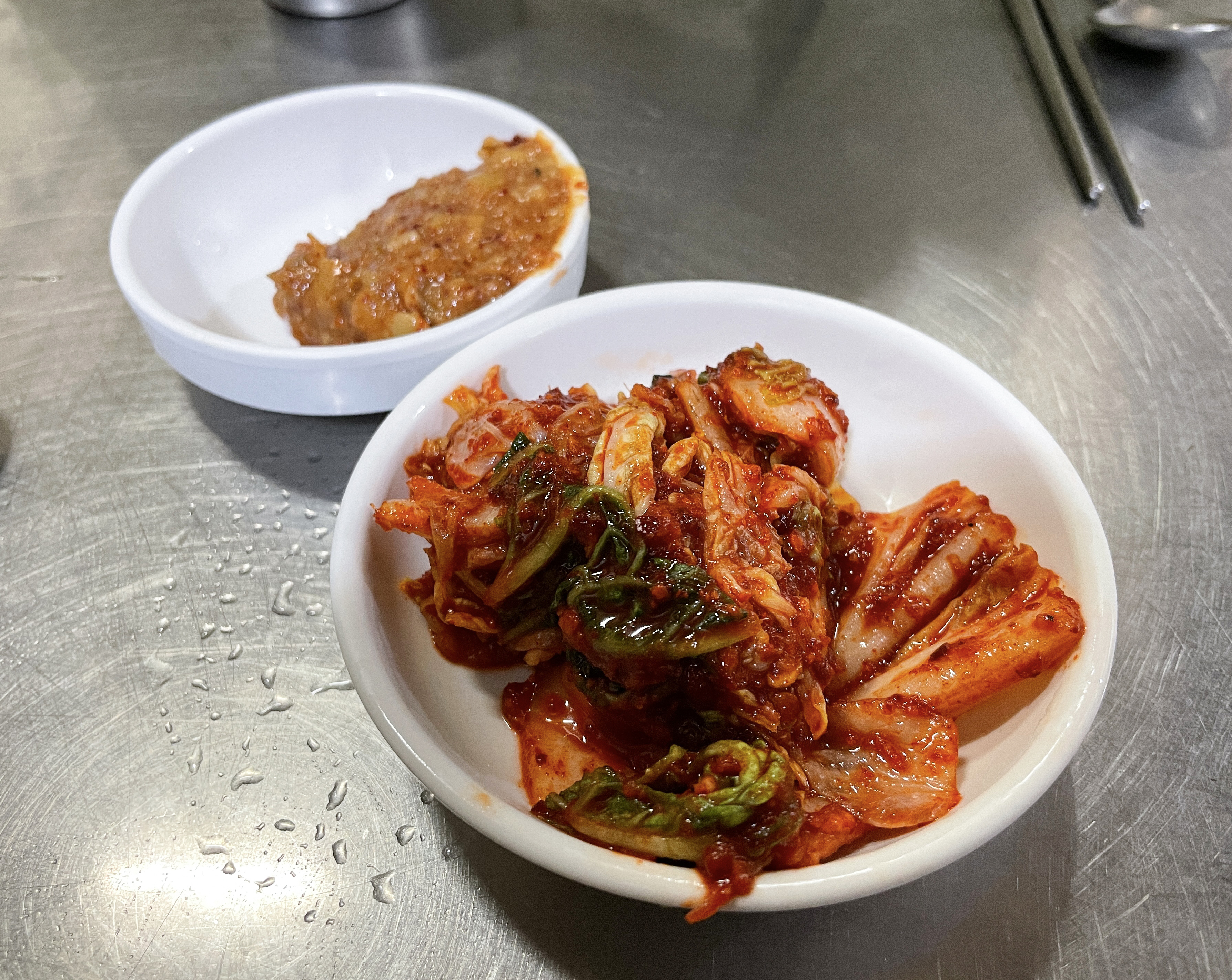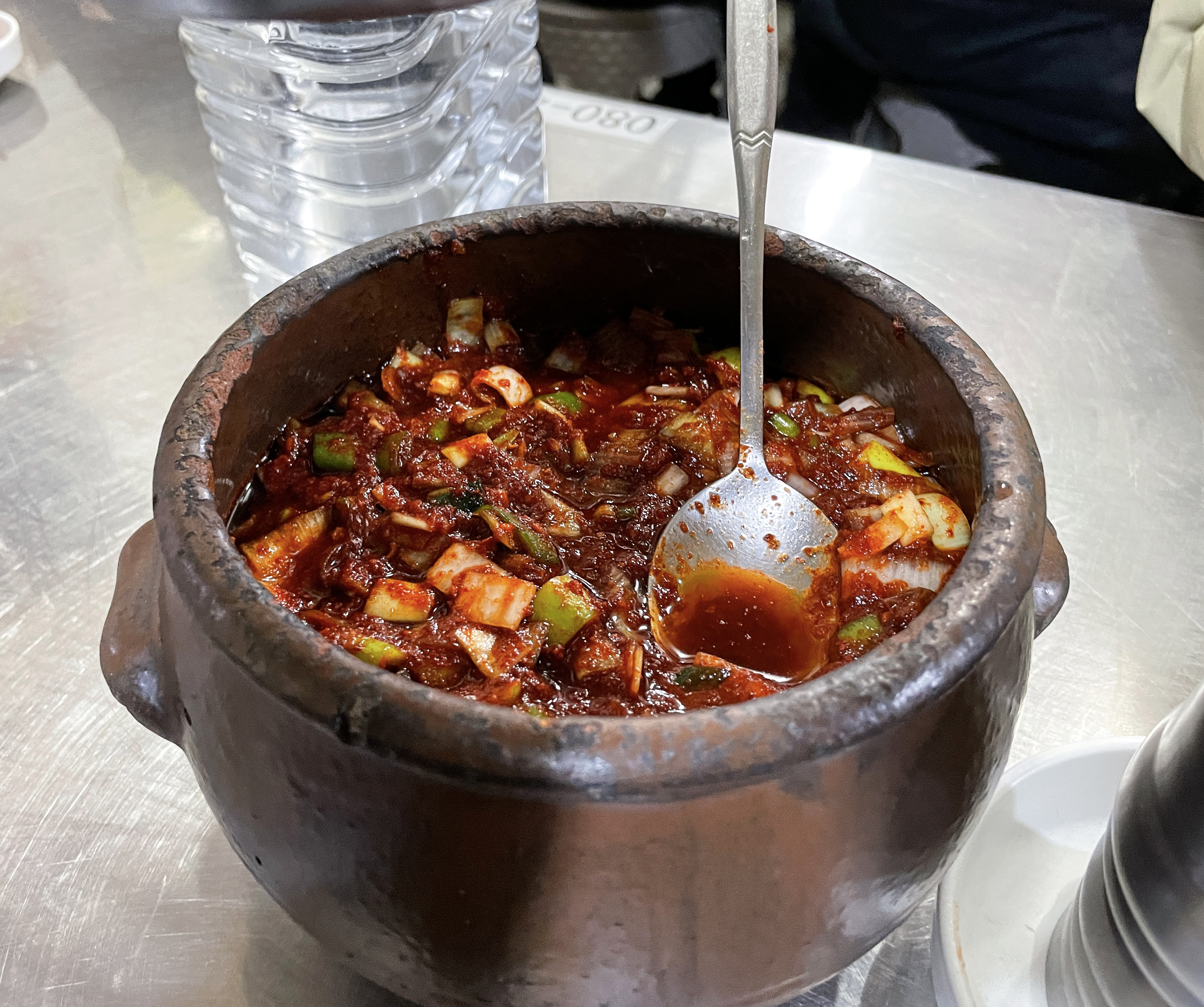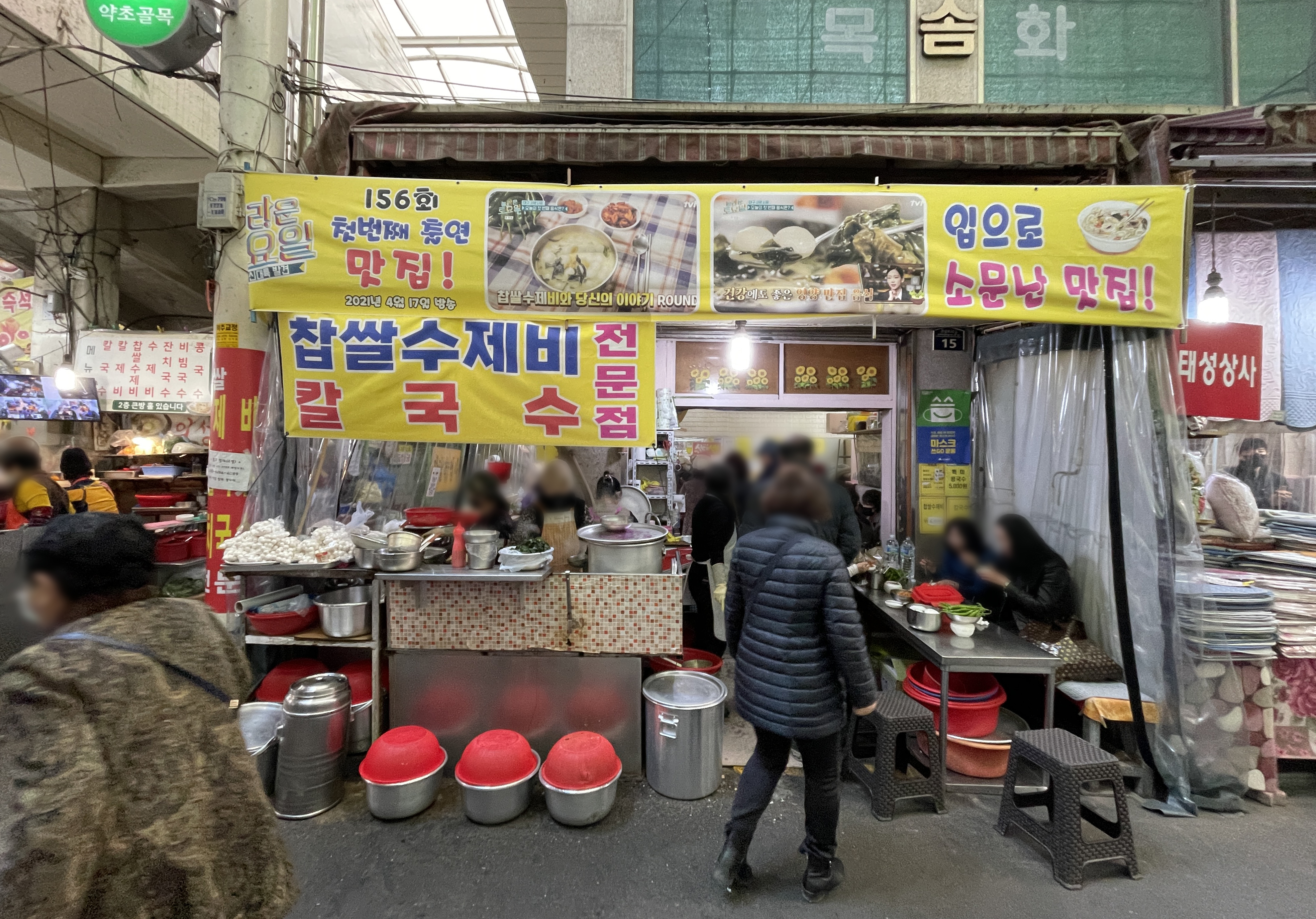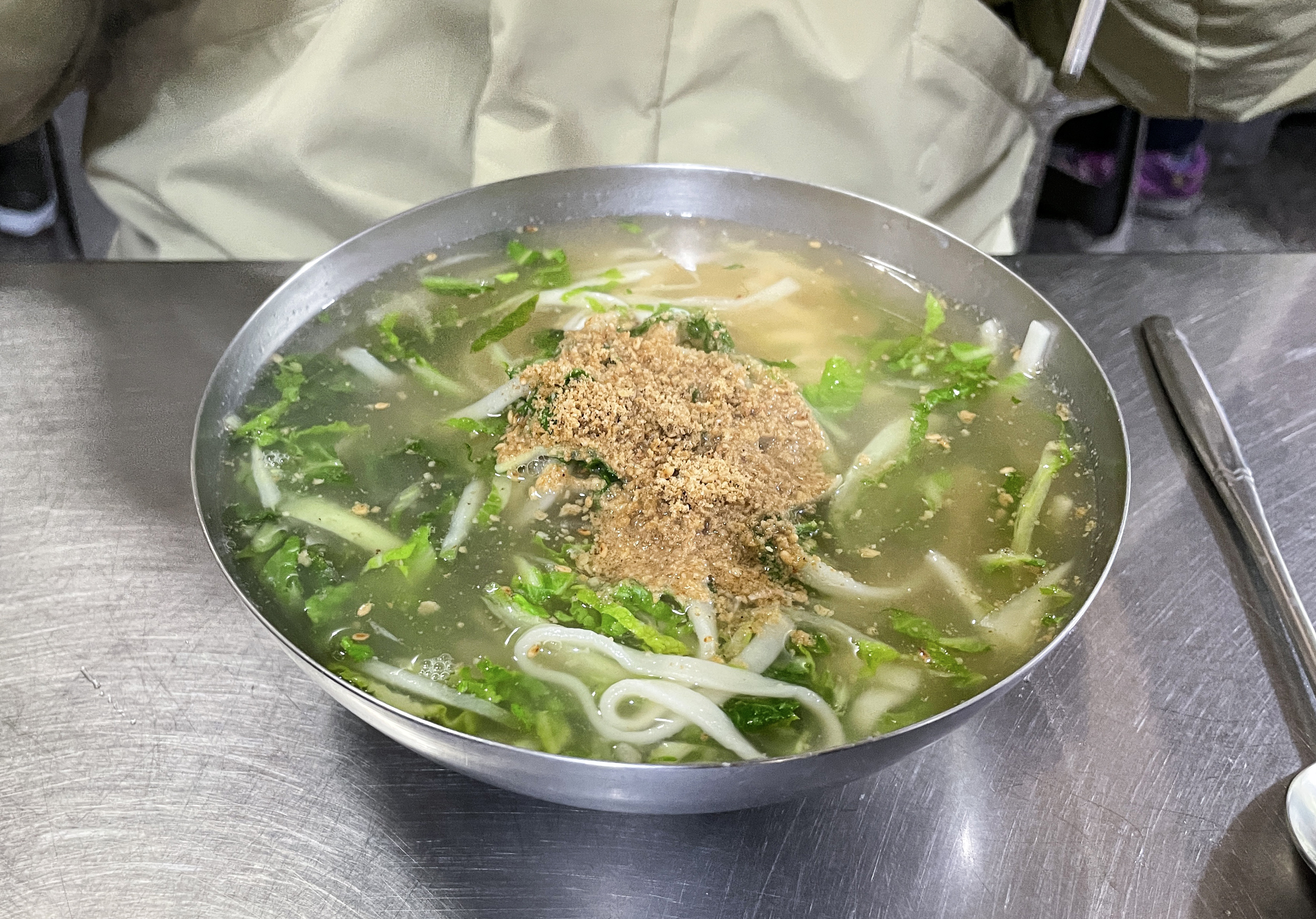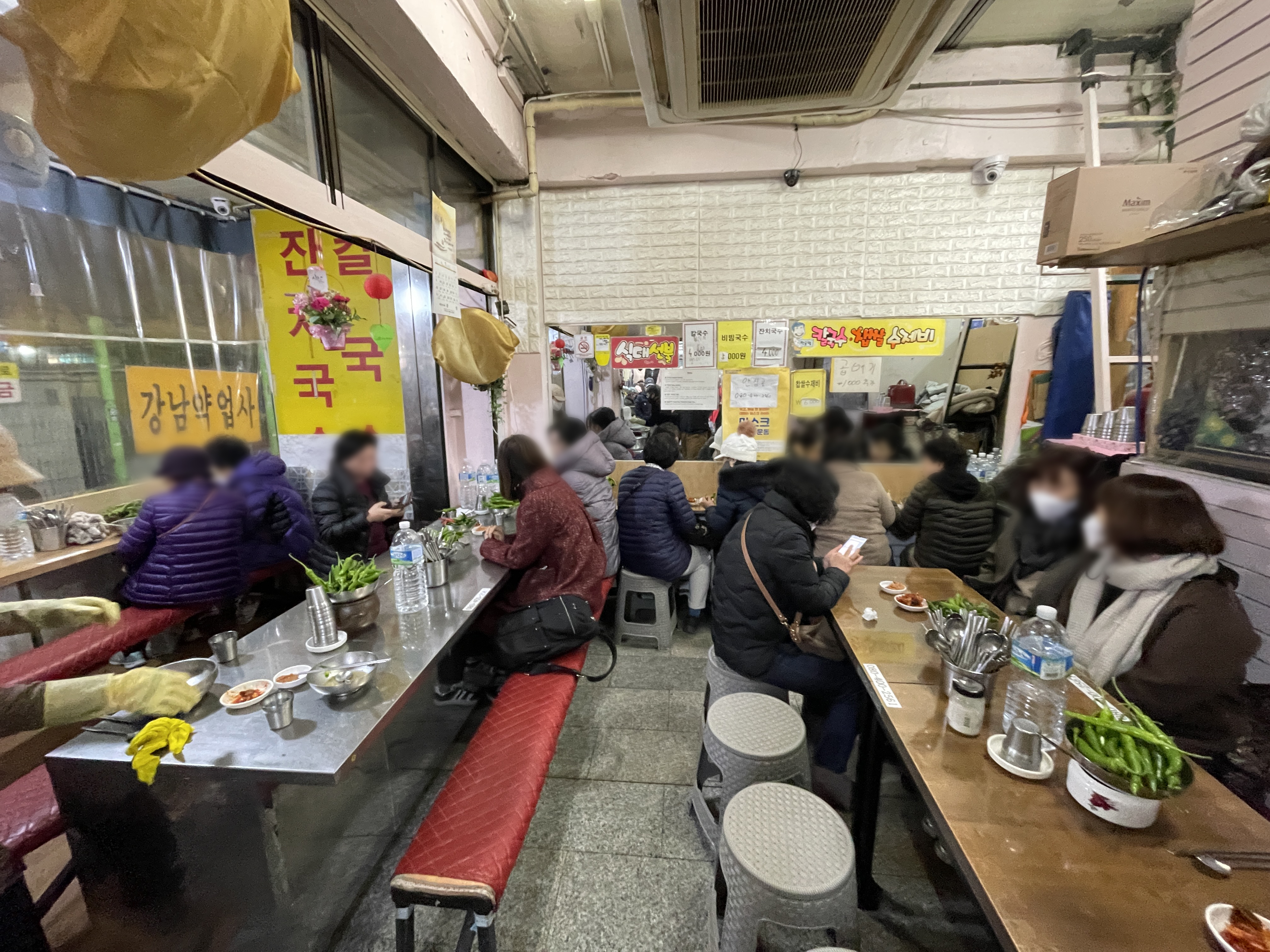 이 날 처음으로 간 곳은 간판은 없고, 현수막으로 '찹쌀수제비, 칼국수 전문점'이라고 적혀있는 장소였습니다. 가게에는 길다란 테이블에 손님들이 마주보고 식사하도록 되어있었고, 중간중간에 물통과 청양고추, 양념장, 수저통이 있었습니다.