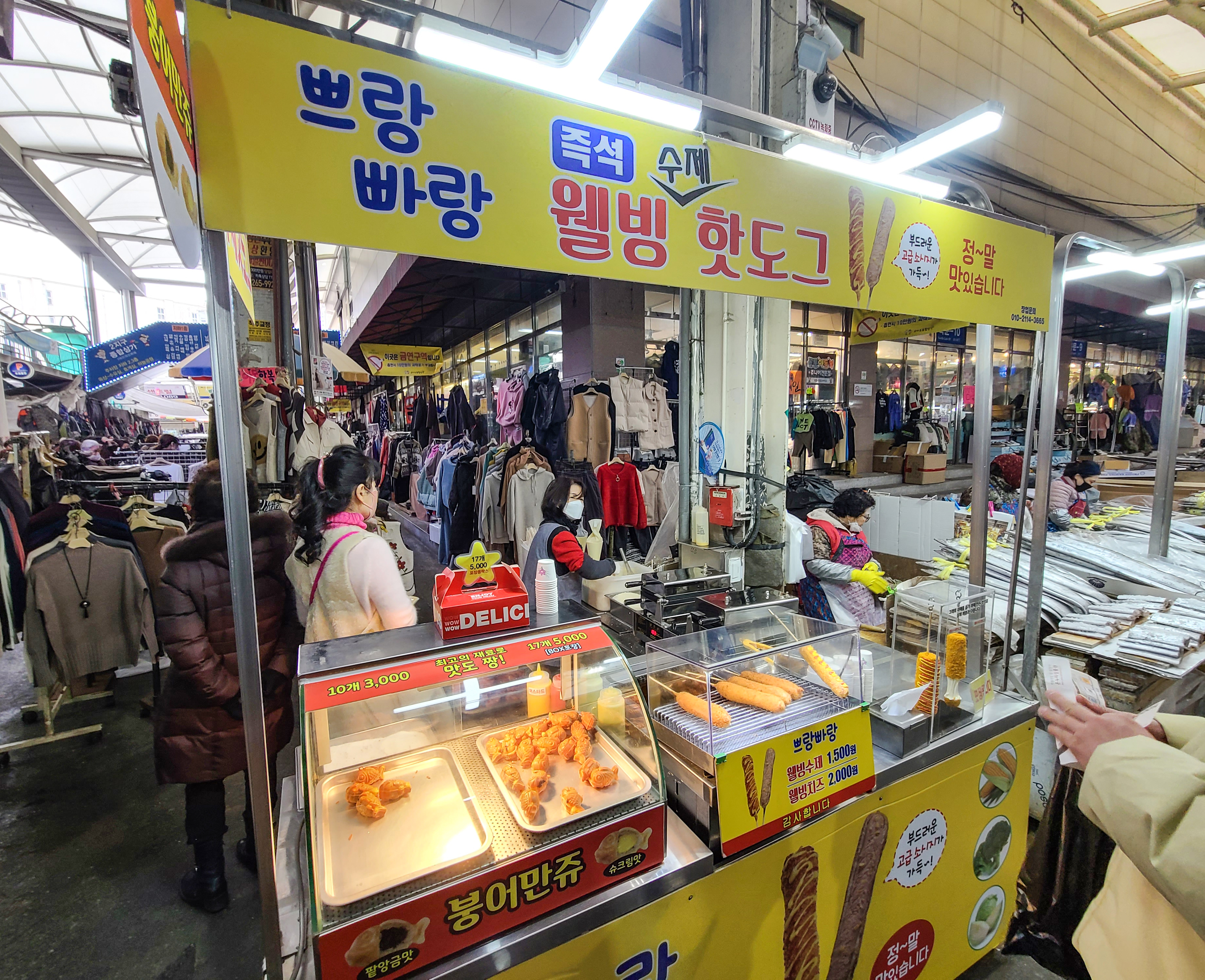 식사를 마친다음 서문시장을 돌아다녔습니다. 사진을 찍지는 않았지만 시장표 식혜와 카스테라를 사고서 나오는데 모퉁이에 '쁘랑빠랑'이라는 즉석웰빙수제핫도그를 판매하는 게 눈에 들어왔습니다. 붕어만쥬와 수제핫도그를 판매하고 있었는데, 저희는 수제핫도그를 주문했죠.
