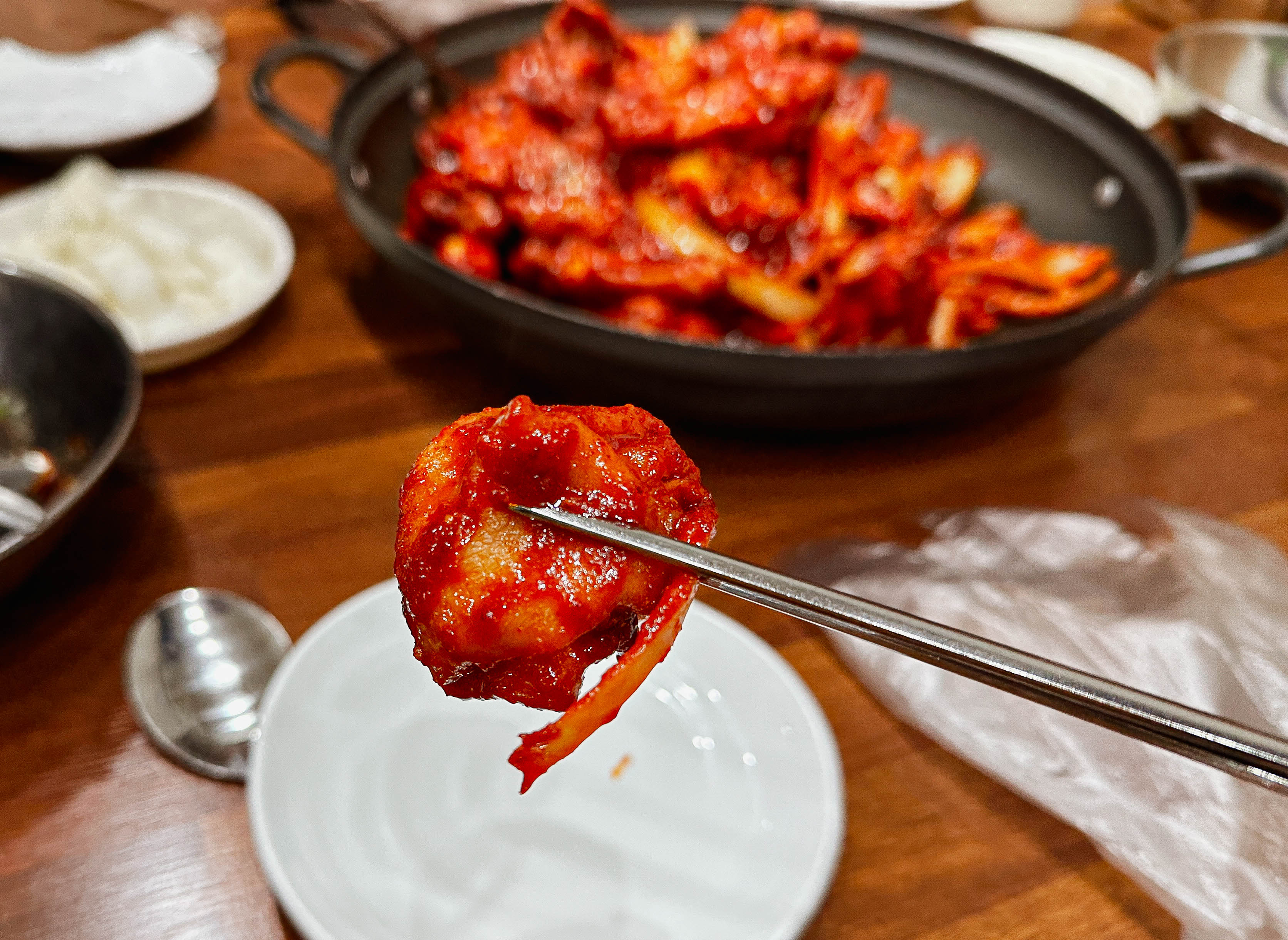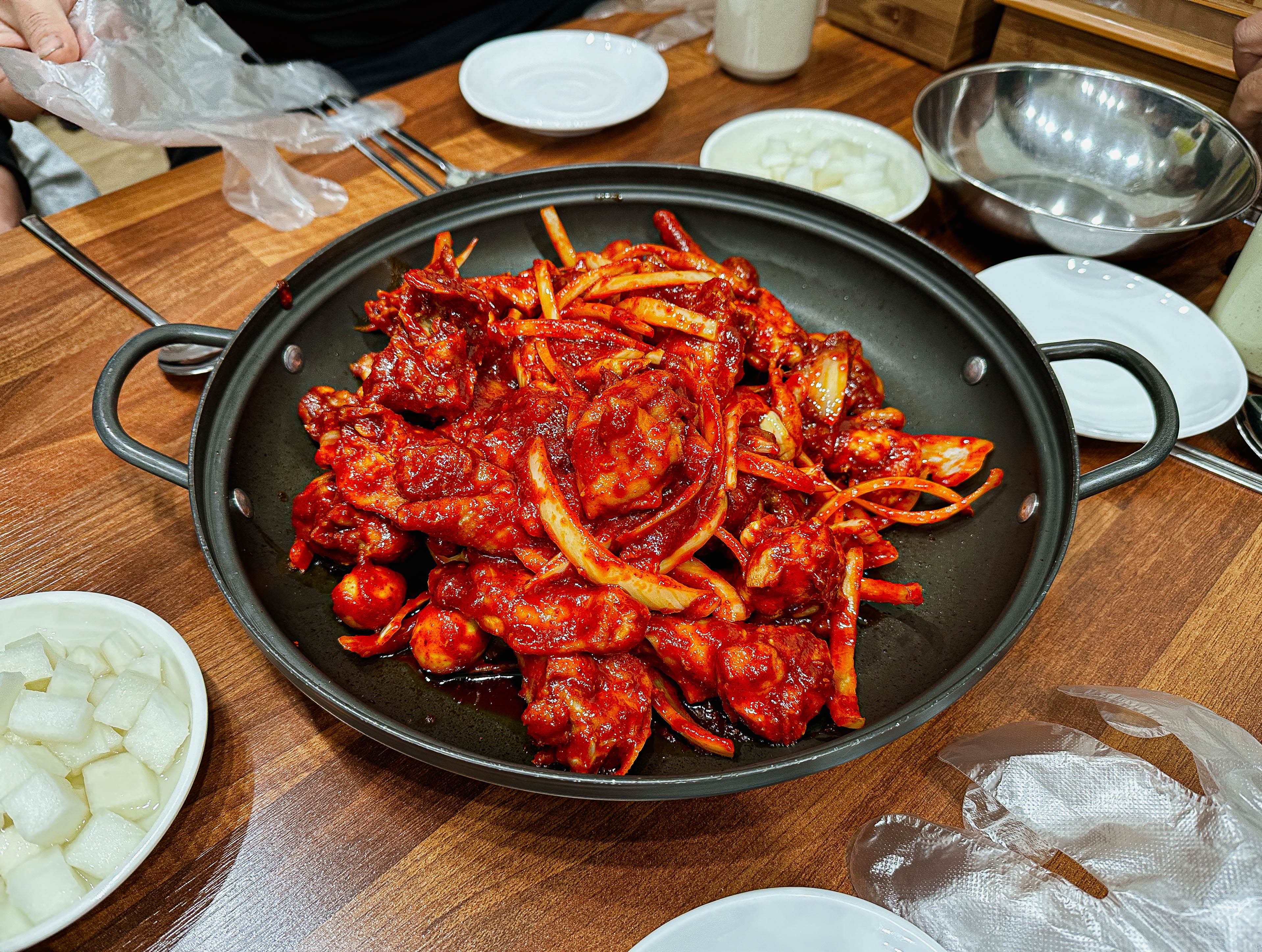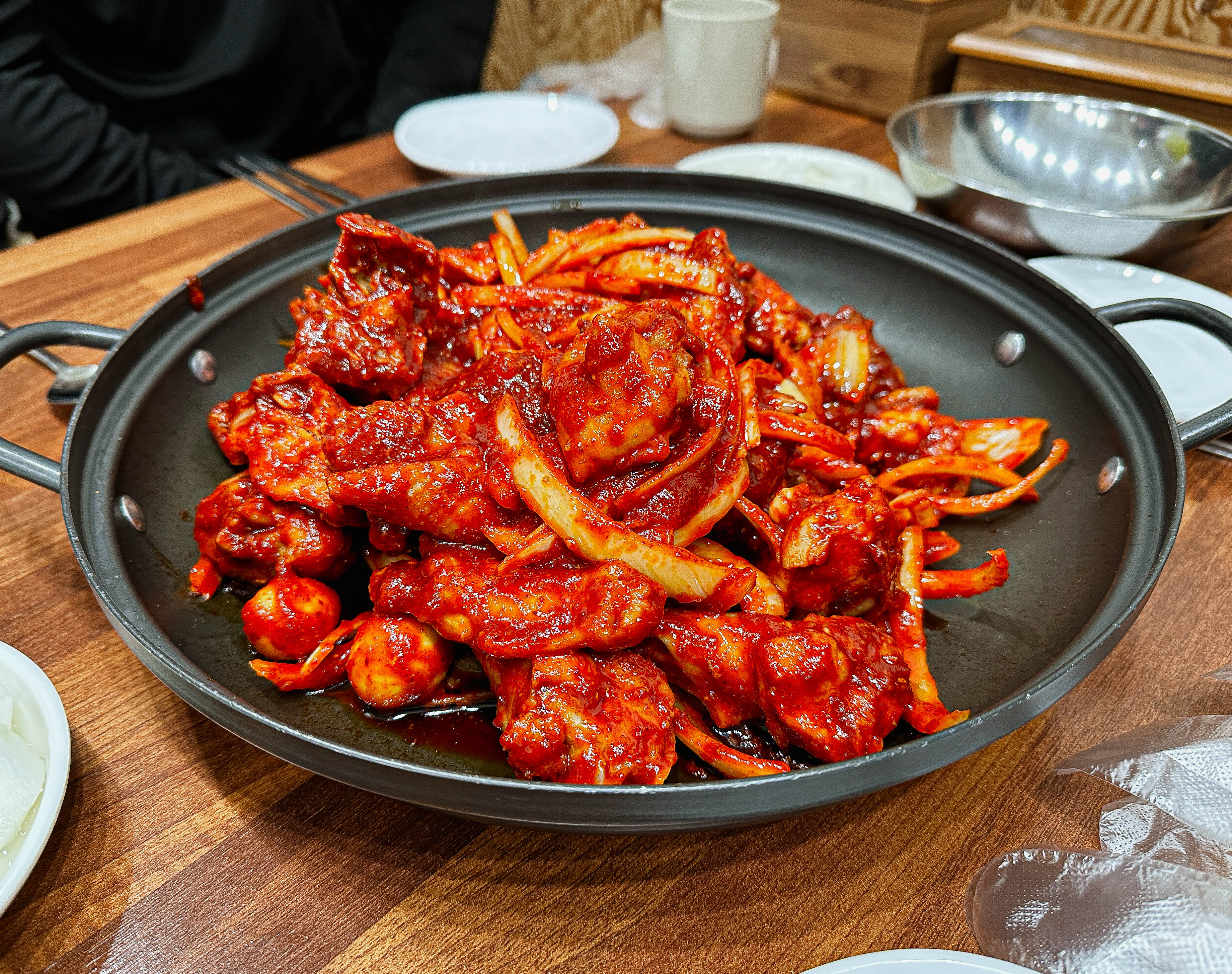 양파와 닭고기 그리고 양념의 조합은 그야말로 매콤 새콤달콤 계속 손이 가는 중독되는 맛이 좋았던 메뉴였습니다. 중간중간 노란 알이 들어있는데, 이것도 나름 고소한 게 별미더라고요.