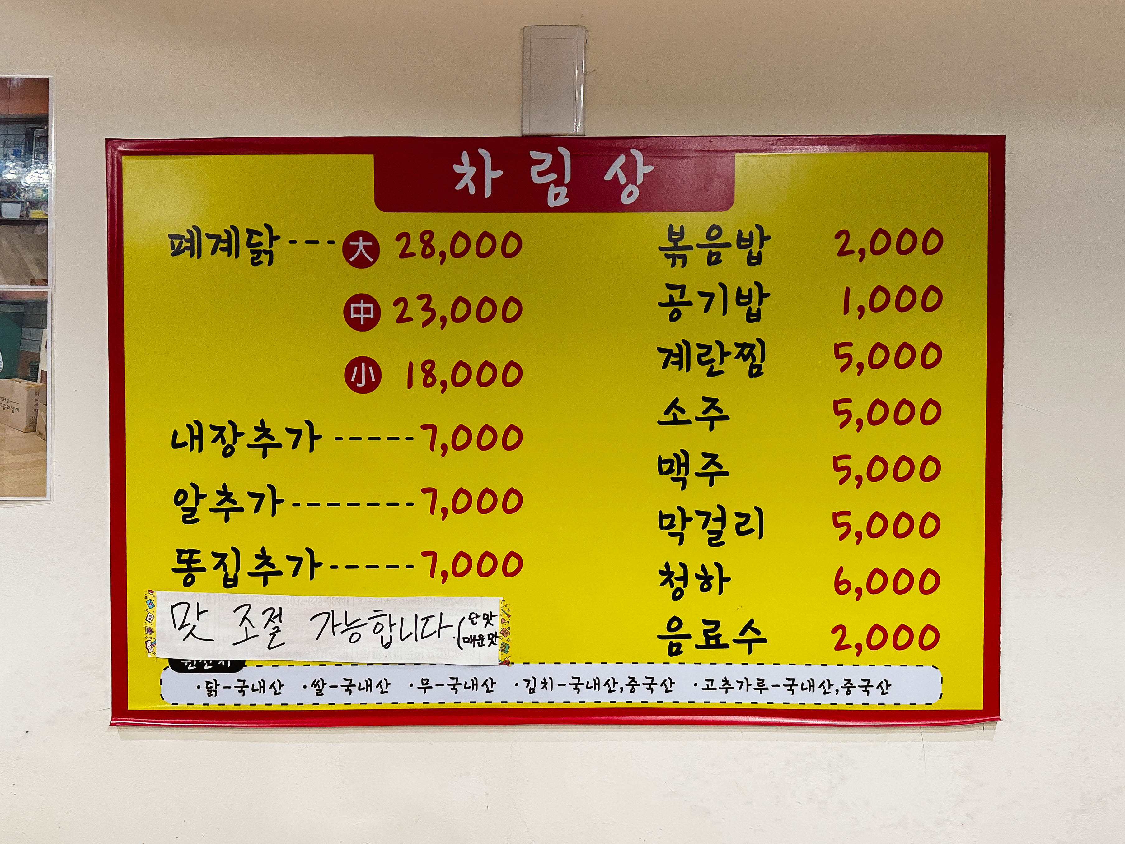 평택 군계폐계닭 본점의 메뉴는 다음과 같습니다. 폐계닭, 내장추가, 알추가, 똥집추가, 볶음밥, 계란찜 등이 있었습니다. 폐계닭은 대/중/소 로 용량을 나눠서 판매하고 있었고, 가격은 18,000~ 28,000원 사이로 크게 부담스럽지 않았습니다.