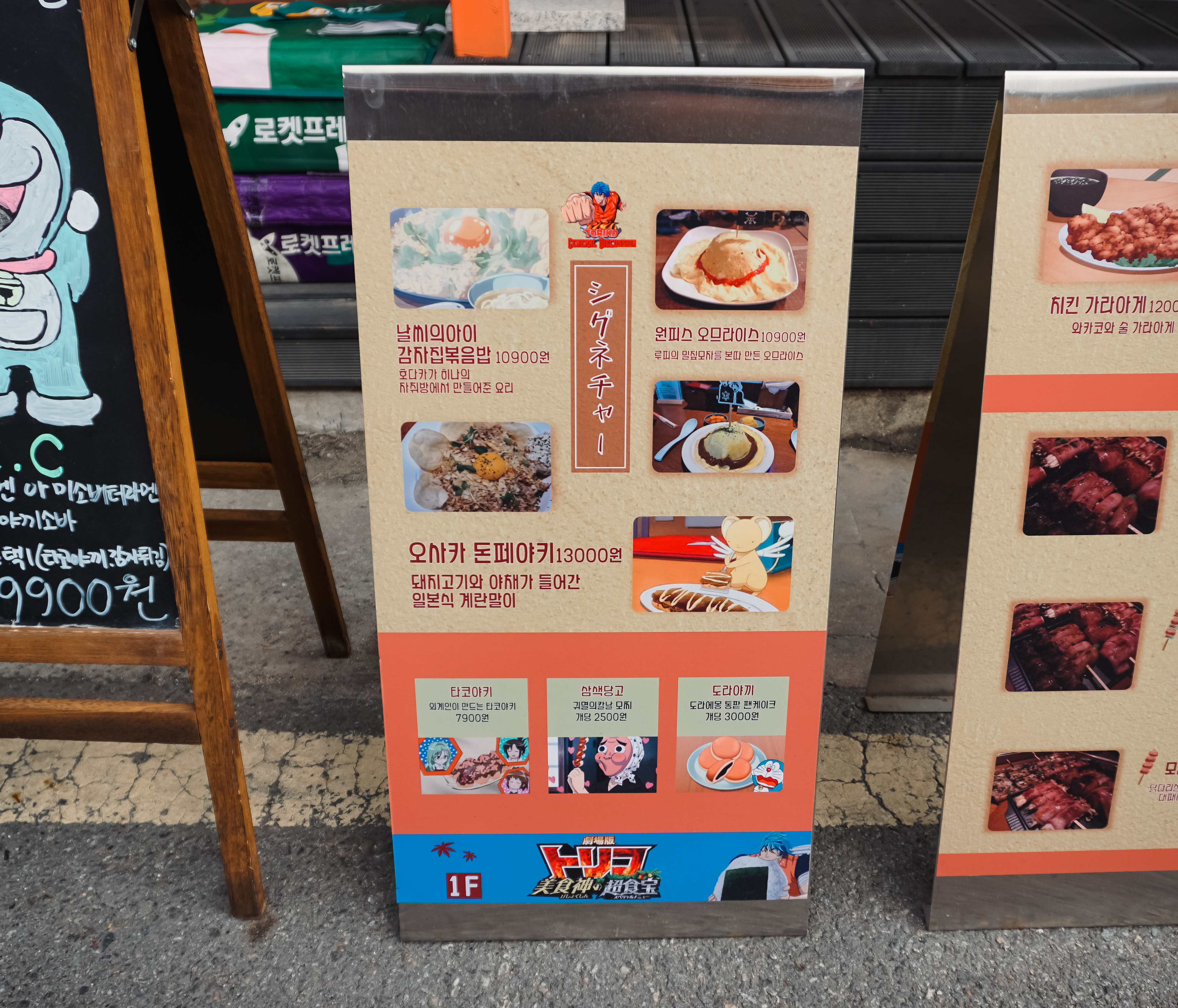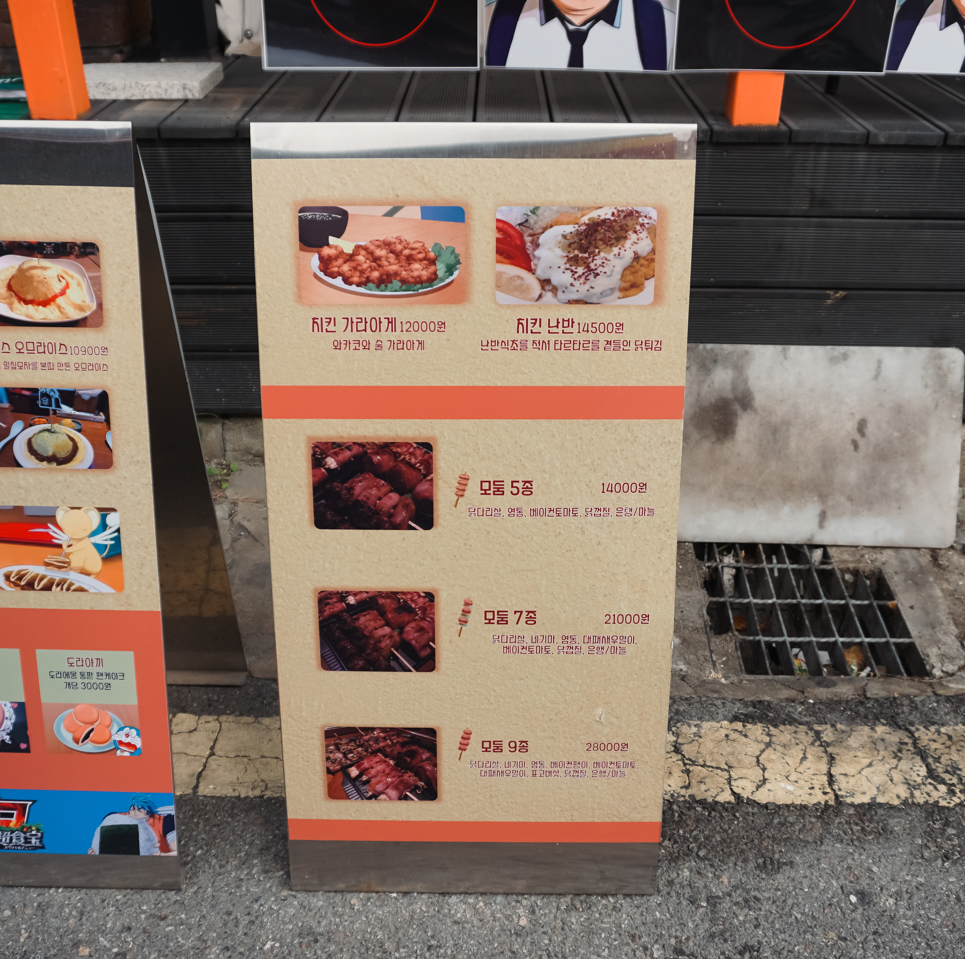 가게 밖에도 메뉴판이 있었는데, 메뉴들이 어떤 애니메이션(만화)에 나왔는지 알려주는 안내가 있었고, 세트메뉴들에 대한 소개가 있었습니다. 영업시간은 월~목요일 11:30~21:00 까지이며, 금~일요일 12:00~22:30 까지였습니다. 브레이크타임은 15:00~17:00 까지입니다.