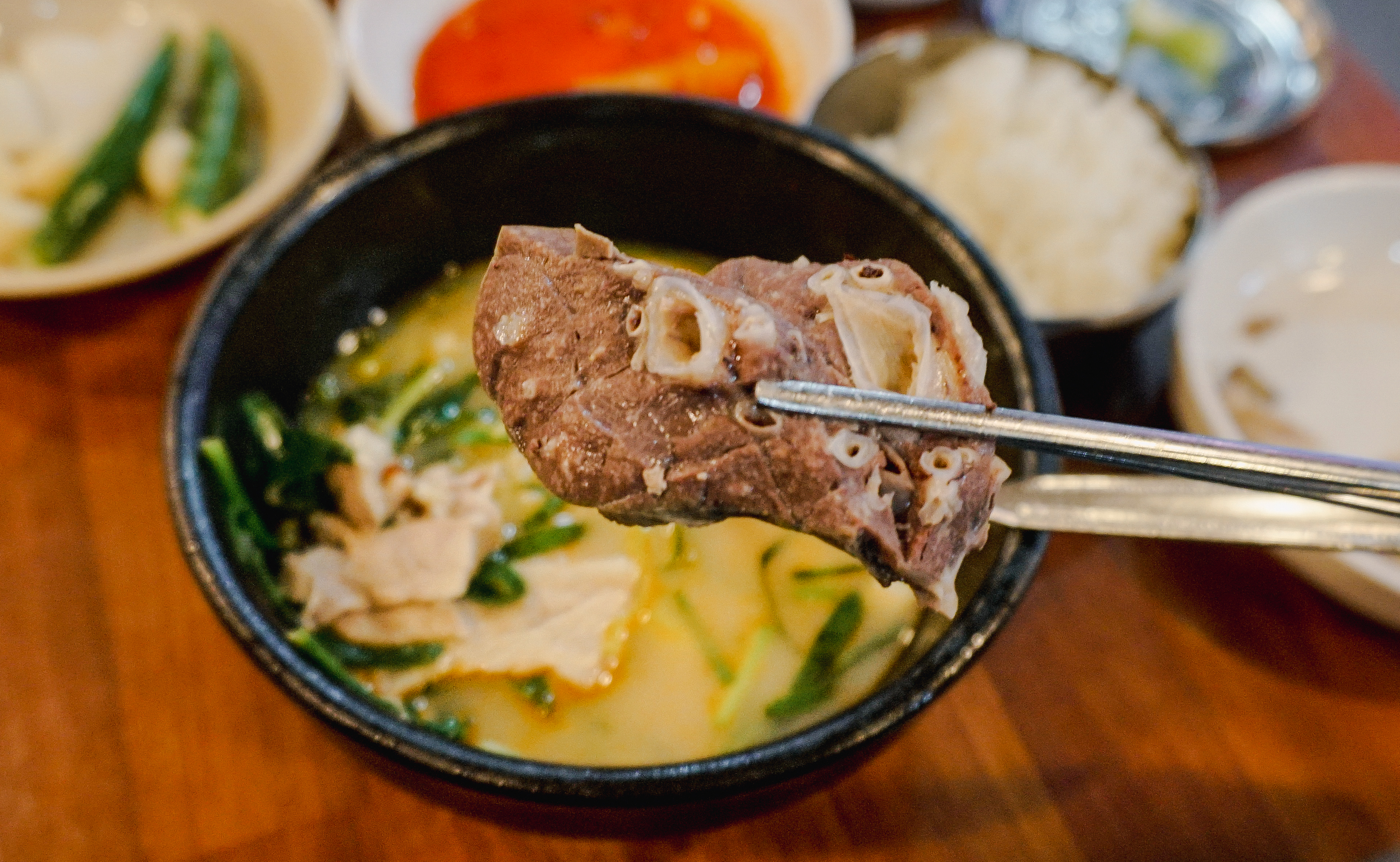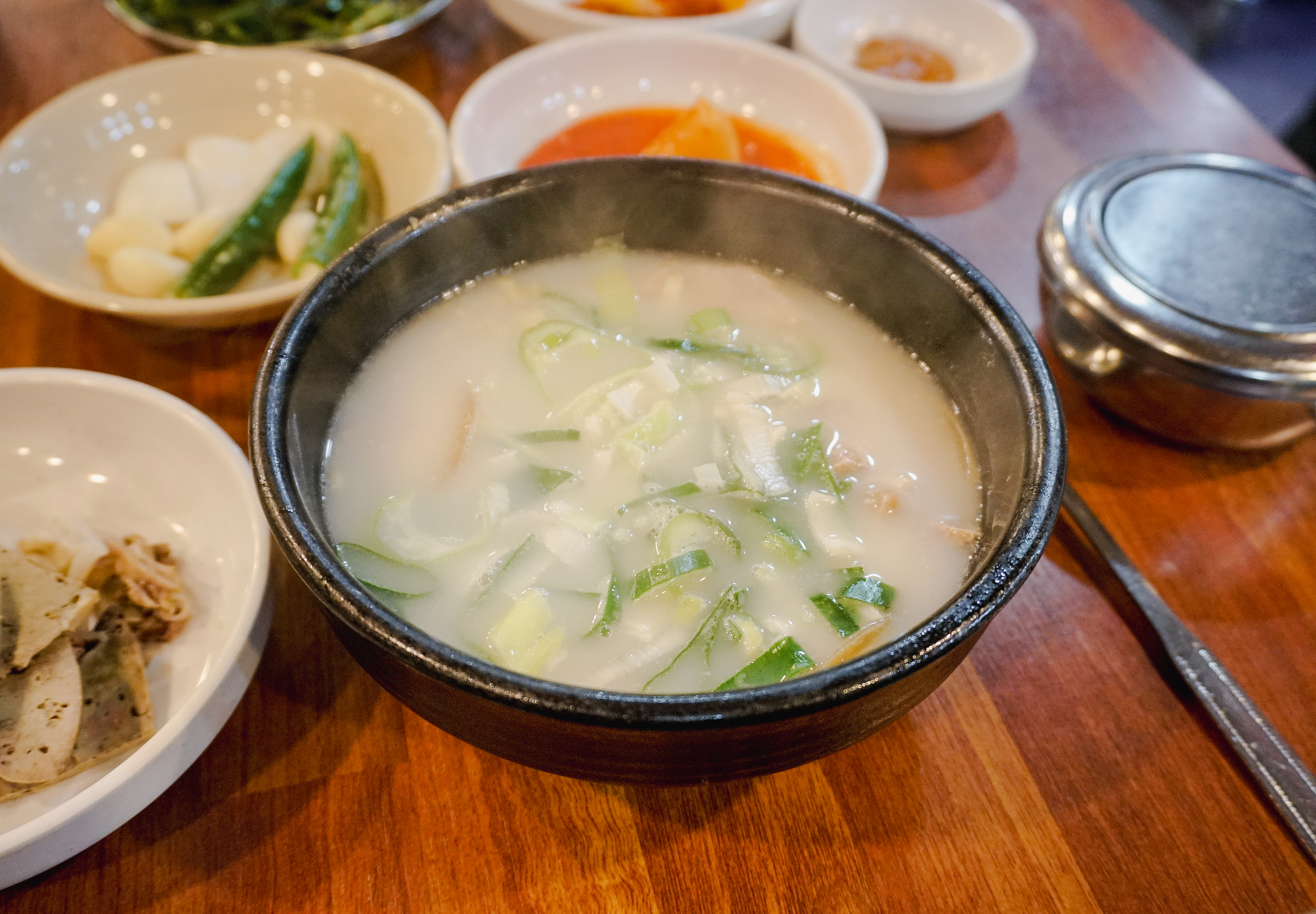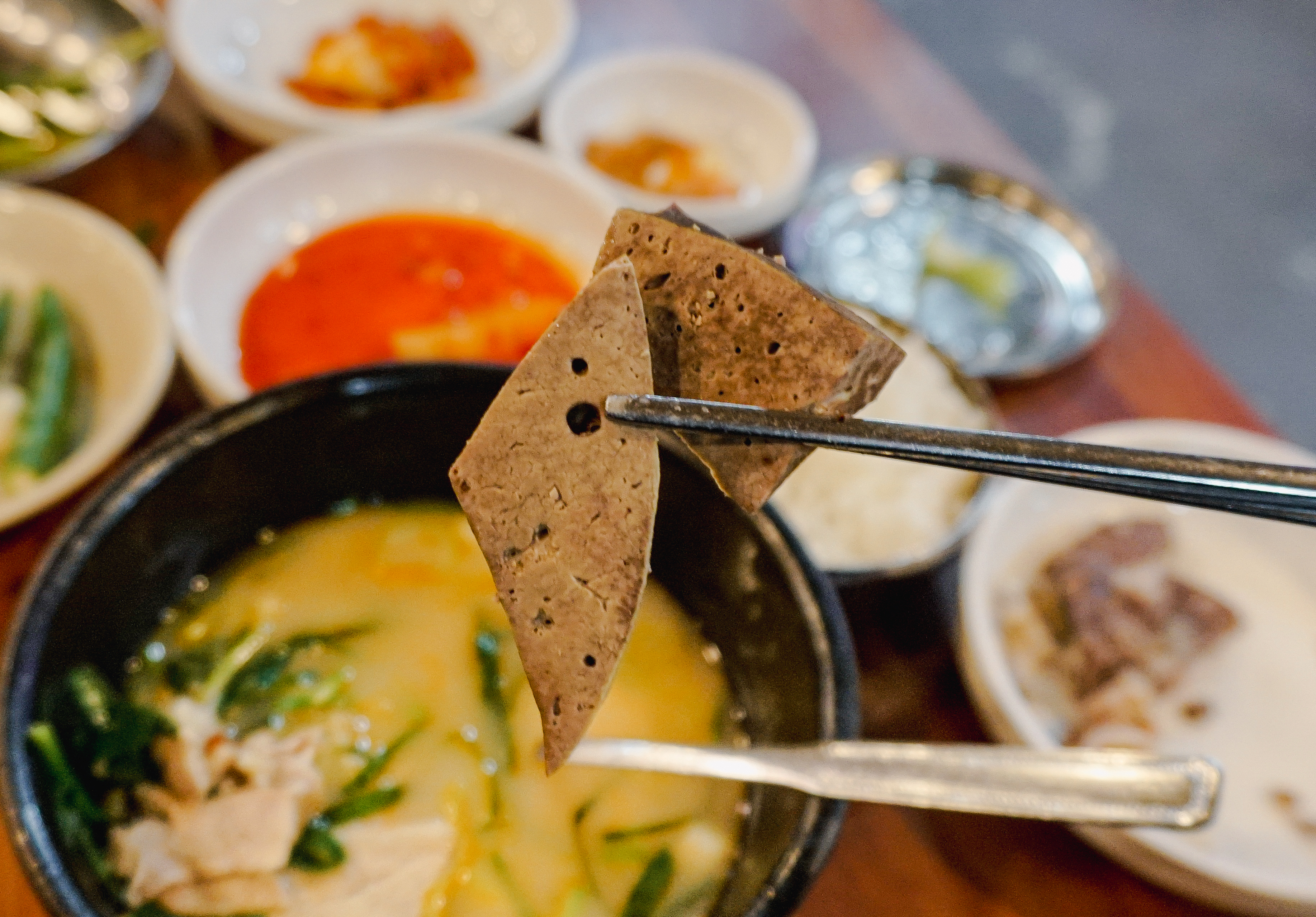 내장도 맛있었지만 돼지국밥 먹으러 갔으니, 돼지국밥을 소개해드려야겠죠? 저는 솔직히 돼지국밥은 좀 고기가 퍽퍽하고 국물이 진득한 맛이 적어서 아쉬웠어요. 새우젓이랑 부추를 풀어넣어도 뭔가 부족한 맛이 채워지지를 않더라고요.
