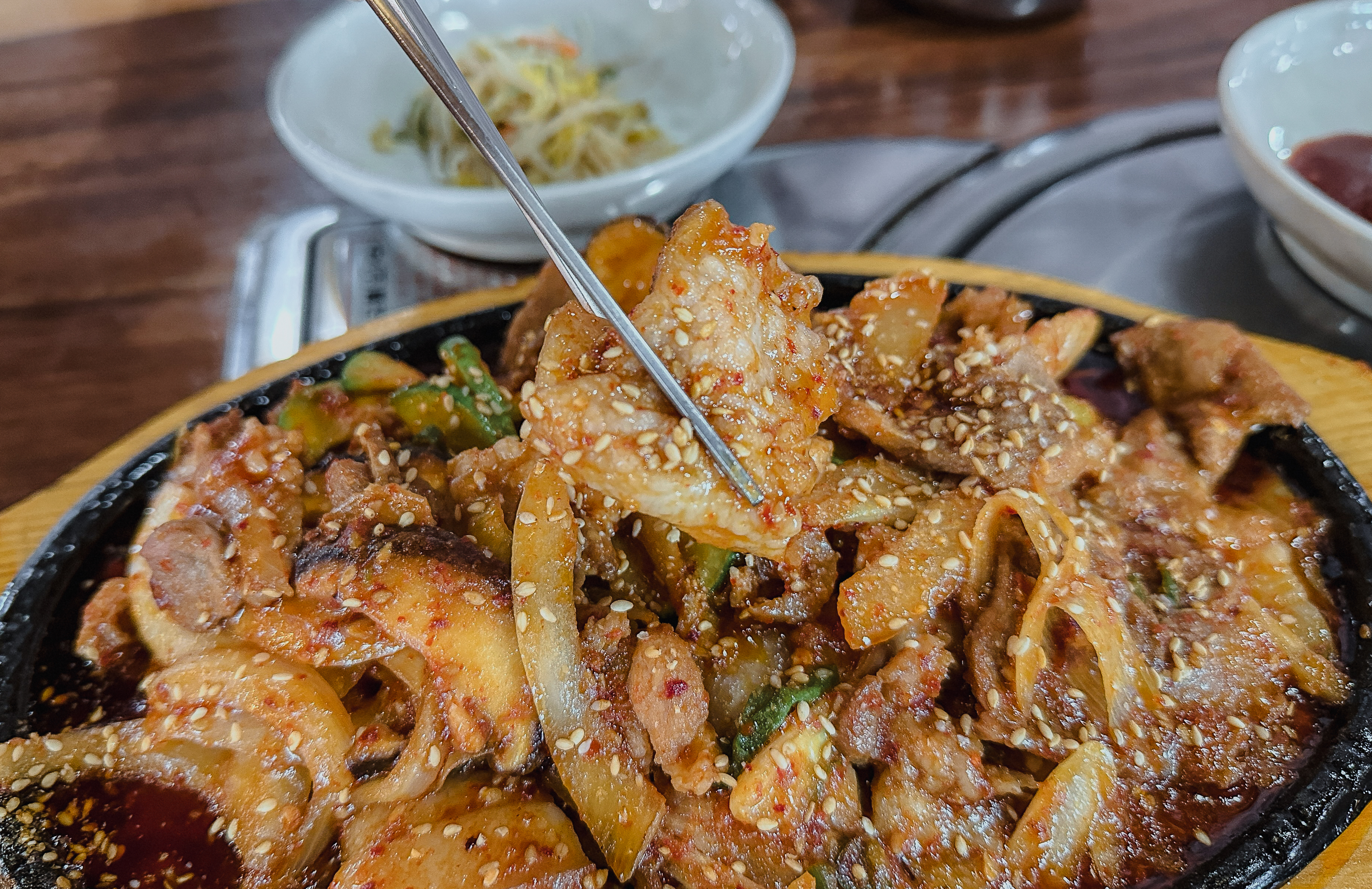 동막골유황천에서 찜질을 하고 찜질방 내 한식당에서 아침 겸 점심으로 제육볶음을 먹었습니다. 큰 기대 없이 먹었는데 무난한 맛이었고요, 어찌 보면 조금 느끼할 수 있는 기름진 메뉴였어요. '맛있는녀석들'이라는 프로그램에 소개된 적이 있는 가게여서 뭔가 차별화된 맛이 있냐면요 그에 대한 대답은 '아니'라고 할 수 있겠습니다.