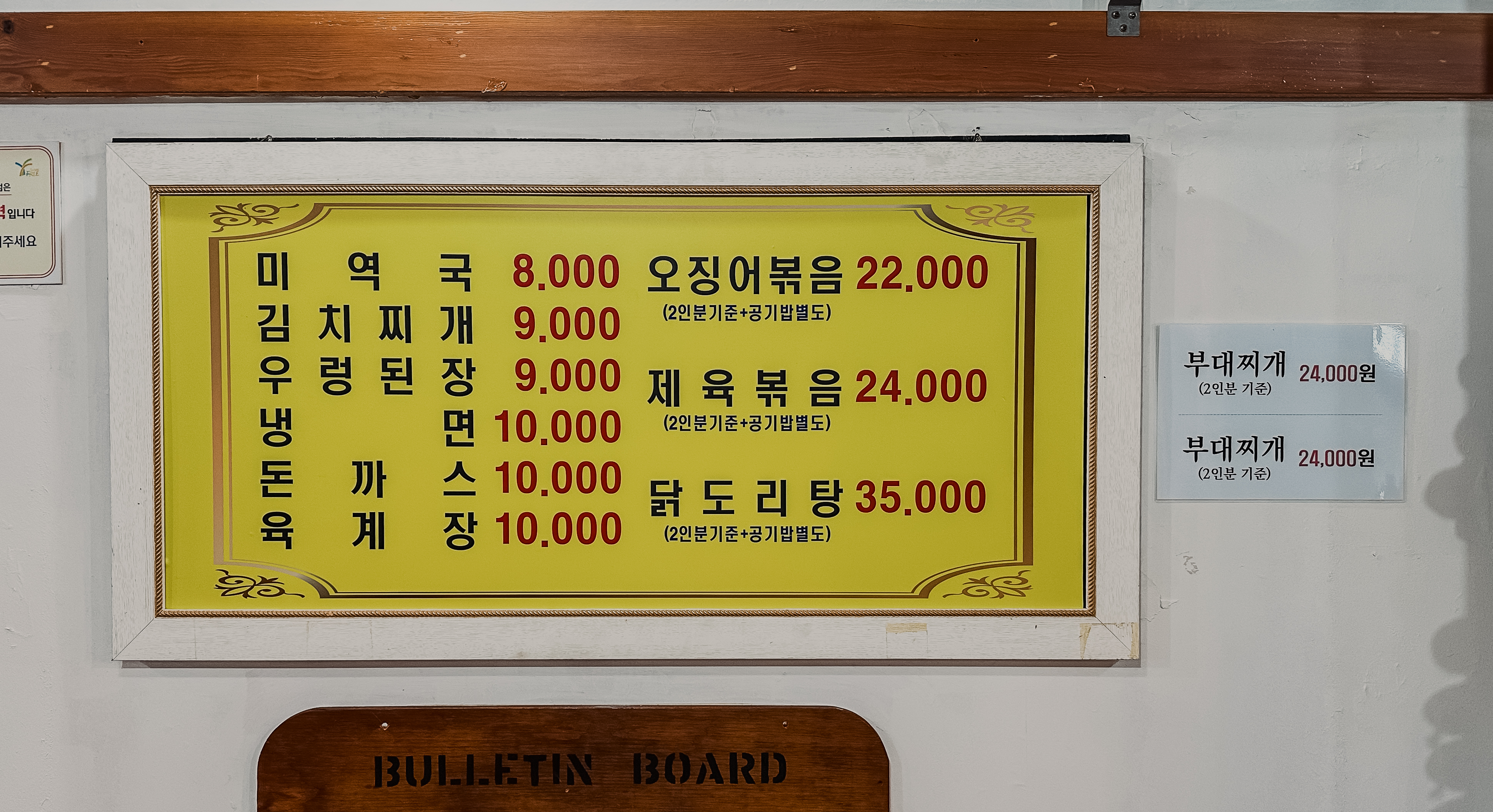 동막골유황천 한식당의 메뉴는 이렇습니다. 미역국, 김치찌개, 우렁된장, 냉면, 돈까스, 육개장, 오징어볶음, 제육볶음, 닭도리탕, 부대찌개로 구성되어 있었고, 옆의 분식집 메뉴와도 같이 드시는 분이 계시길래 분식집 메뉴까지 소개해드리자면 얼큰굴새우수제비, 굴새우수제비, 얼큰굴새우칼국수, 굴새우칼국수, 떡라면, 떡볶이, 떡만두국, 만두, 라면 등이 있었습니다.