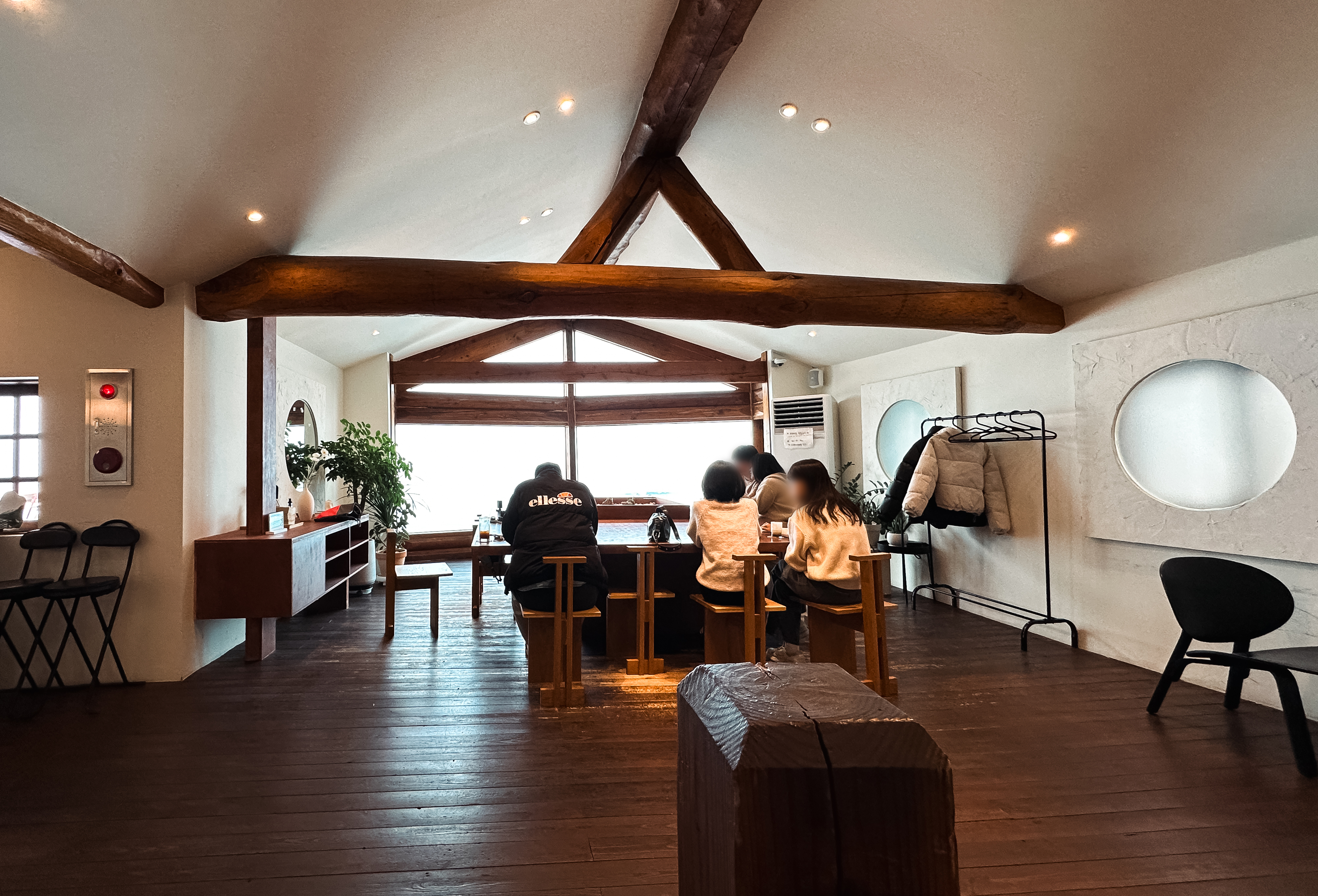카페우디의 1층도 바다를 바라볼 수 있도록 자리가 마련되어 있었고, 2층은 높은 곳에서 통창을 통해 바다를 내려다볼 수 있어서 좋았습니다. 저희는 평일 한가한 시간에 방문해서 여유 있는 분위기에 커피를 마실 수 있었는데, 주말엔 오션뷰 때문에라도 손님들이 더 많을 것 같았습니다.