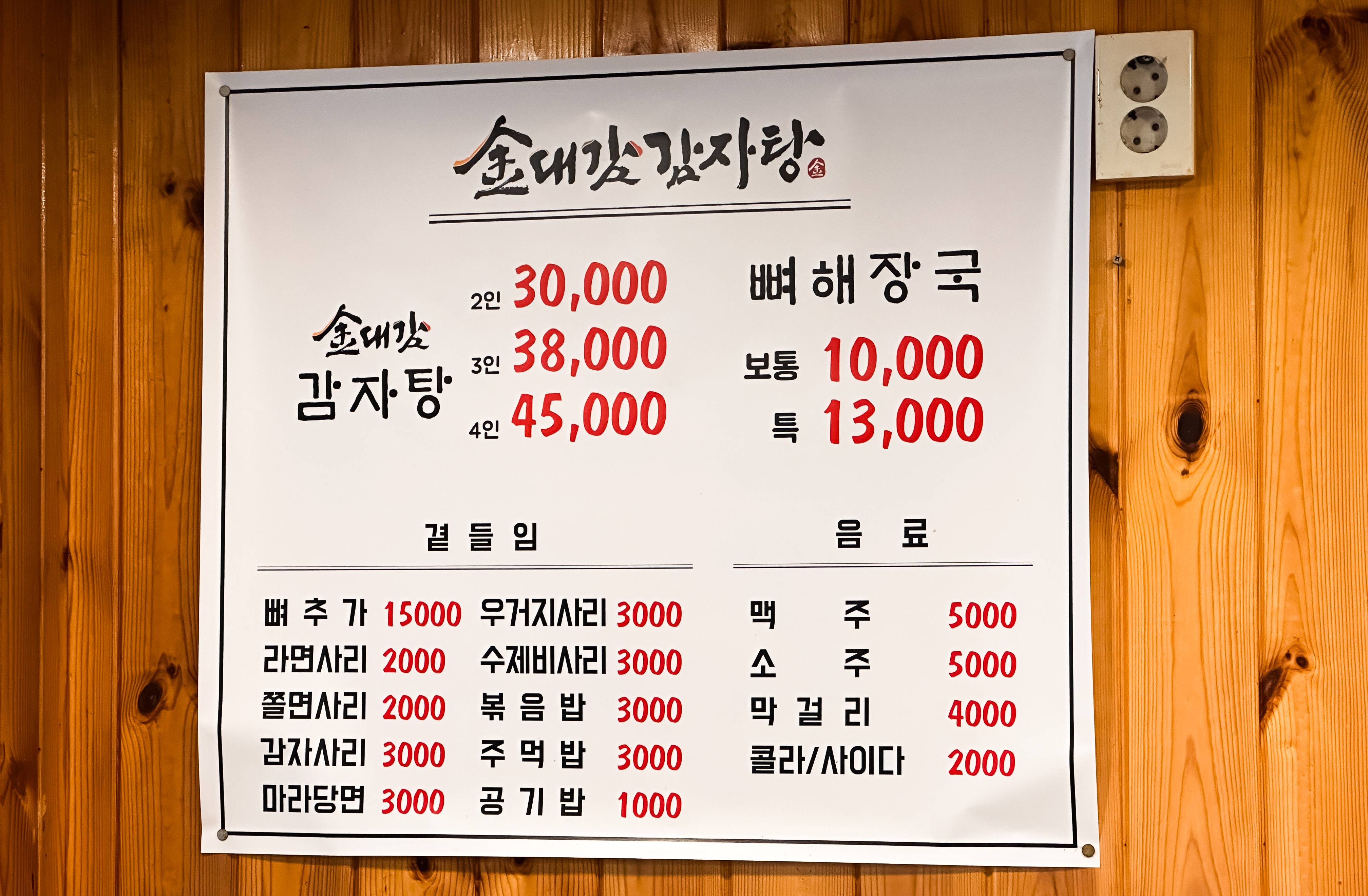 김대감감자탕은 서울 송파구 거여동 42-19, 1층 에 위치해 있었고, 손님들이 많이 찾는 가게였습니다. 가게에는 주차공간이 협소하지만 2대 정도 댈 수 있었는데, 인근에는 불법주차 단속을 하고 있기 때문에 주의해야 했습니다. 영업시간은 10:00~22:30 까지였습니다. 마지막주문은 22:00 까지라고 합니다.