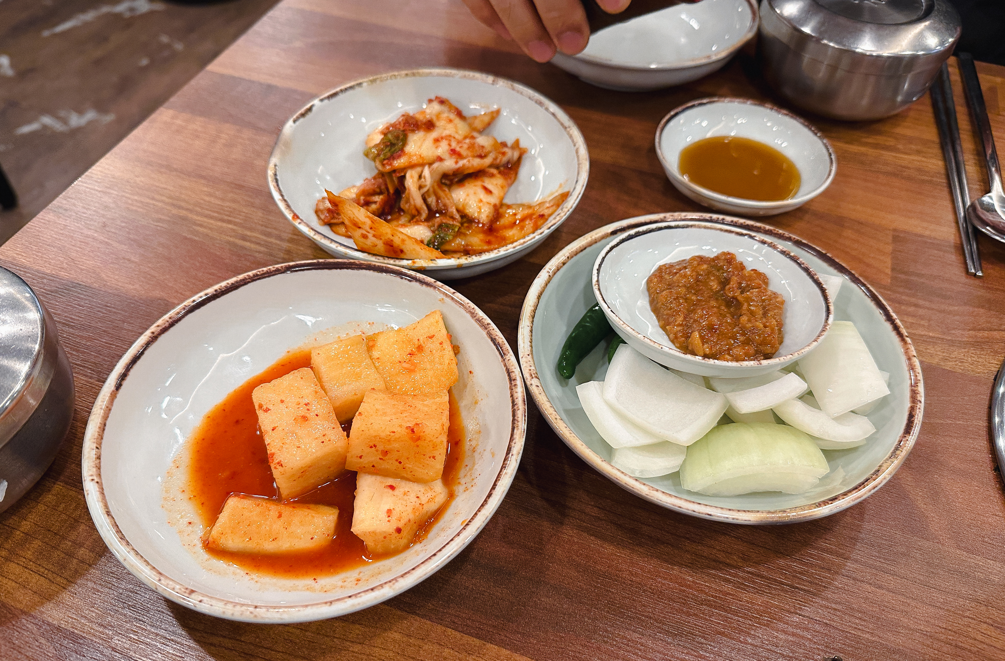 뼈해장국 특 사이즈에는 돈등뼈 3덩이가 들어있었는데 평소 뼈해장국 먹을 때 양이 부족하다고 느끼시는 분은 괜찮게 드실 수 있는 메뉴였습니다. 반찬으로는 배추김치, 무김치, 양파, 고추가 나왔습니다.