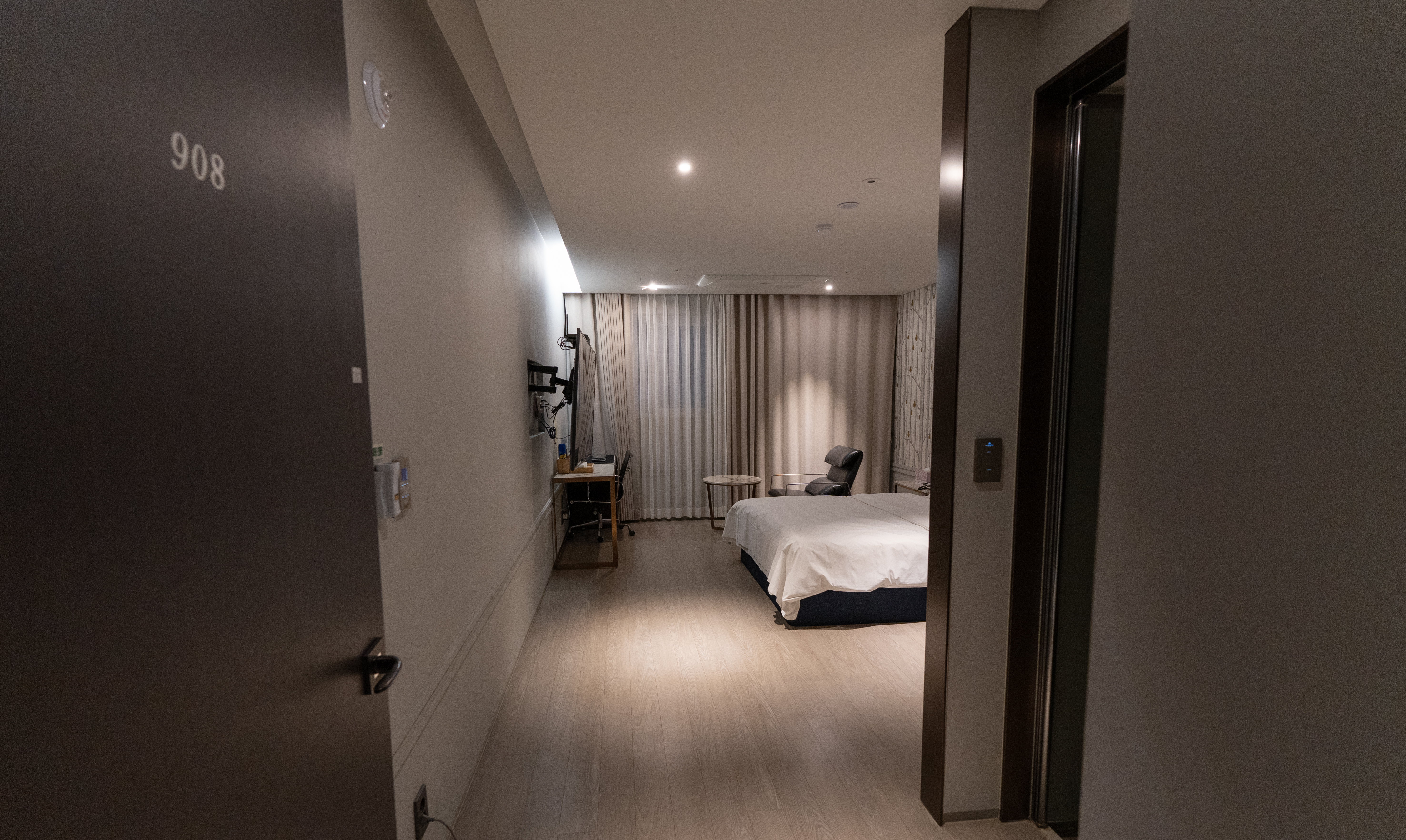 침실에는 65인치 대형 TV와 공기청정기, 스타일러, 커피포트, 냉장고, PC가 있었고, 스타일러와 공기청정기는 보통 잘 관리되는 호텔에만 있는 가전이라 이곳도 꽤 관리가 잘 되는 호텔이라고 할 수 있겠습니다.