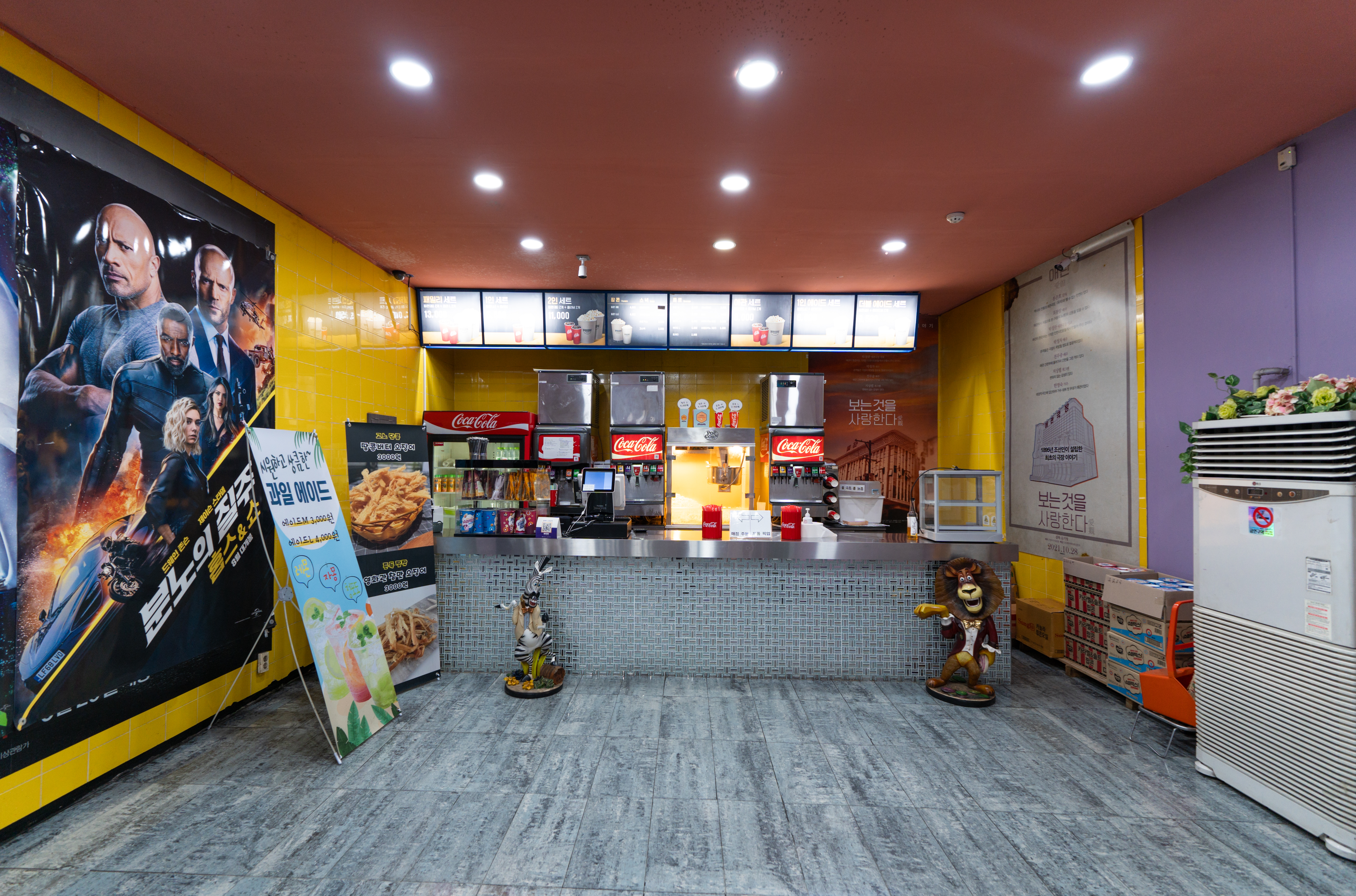 인천 애관극장의 매점은 위 사진처럼 생겼습니다. 팝콘, 땅콩버터오징어, 영화관참맛오징어, 음료, 세트 등이 있었고, 가격대는 일반 상영관보다 살짝 저렴한 느낌이 있었습니다. 건물에는 간식을 먹거나 잠시 쉴수 있는 휴게시설이 곳곳에 마련되어 있었습니다.