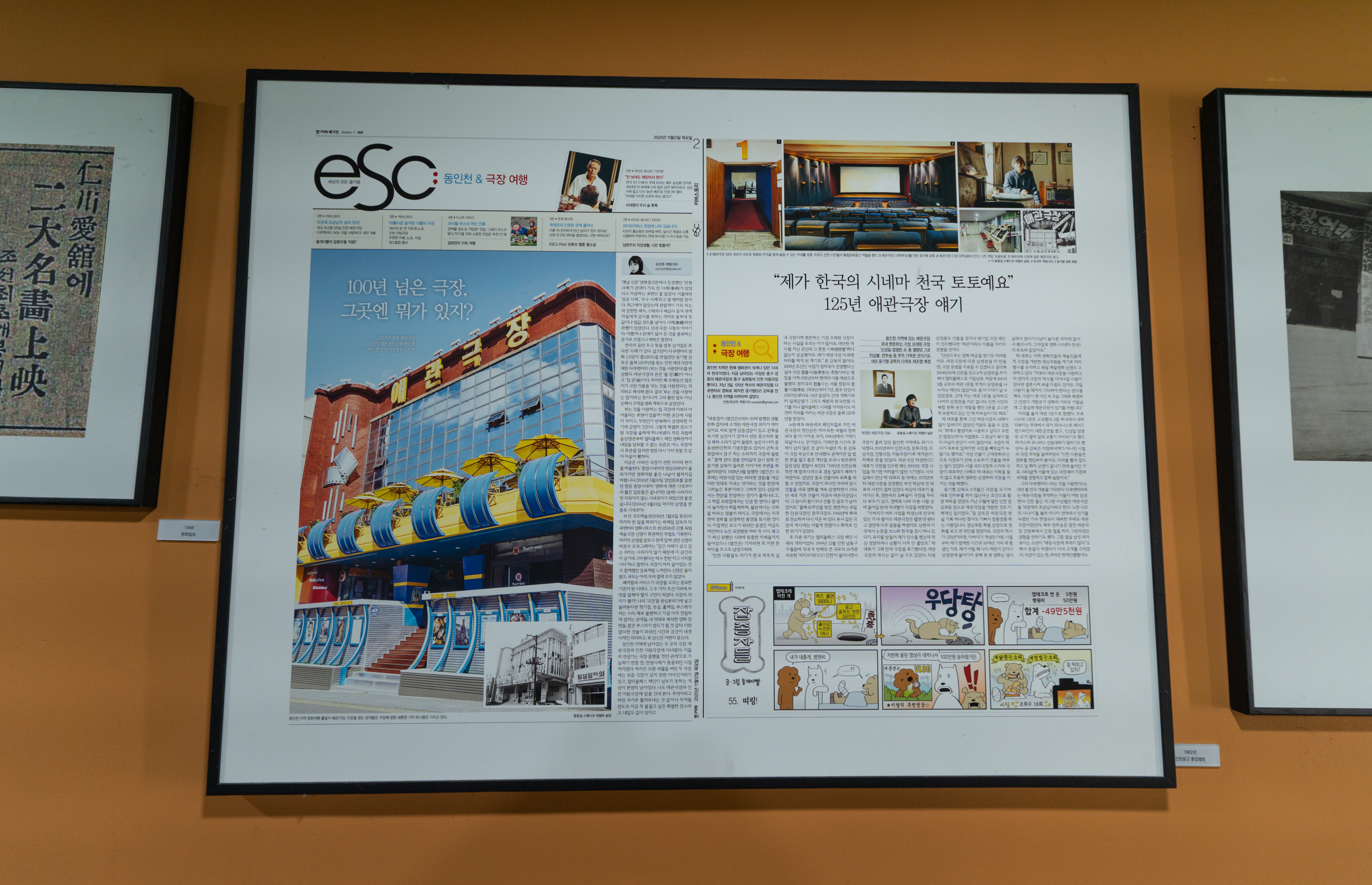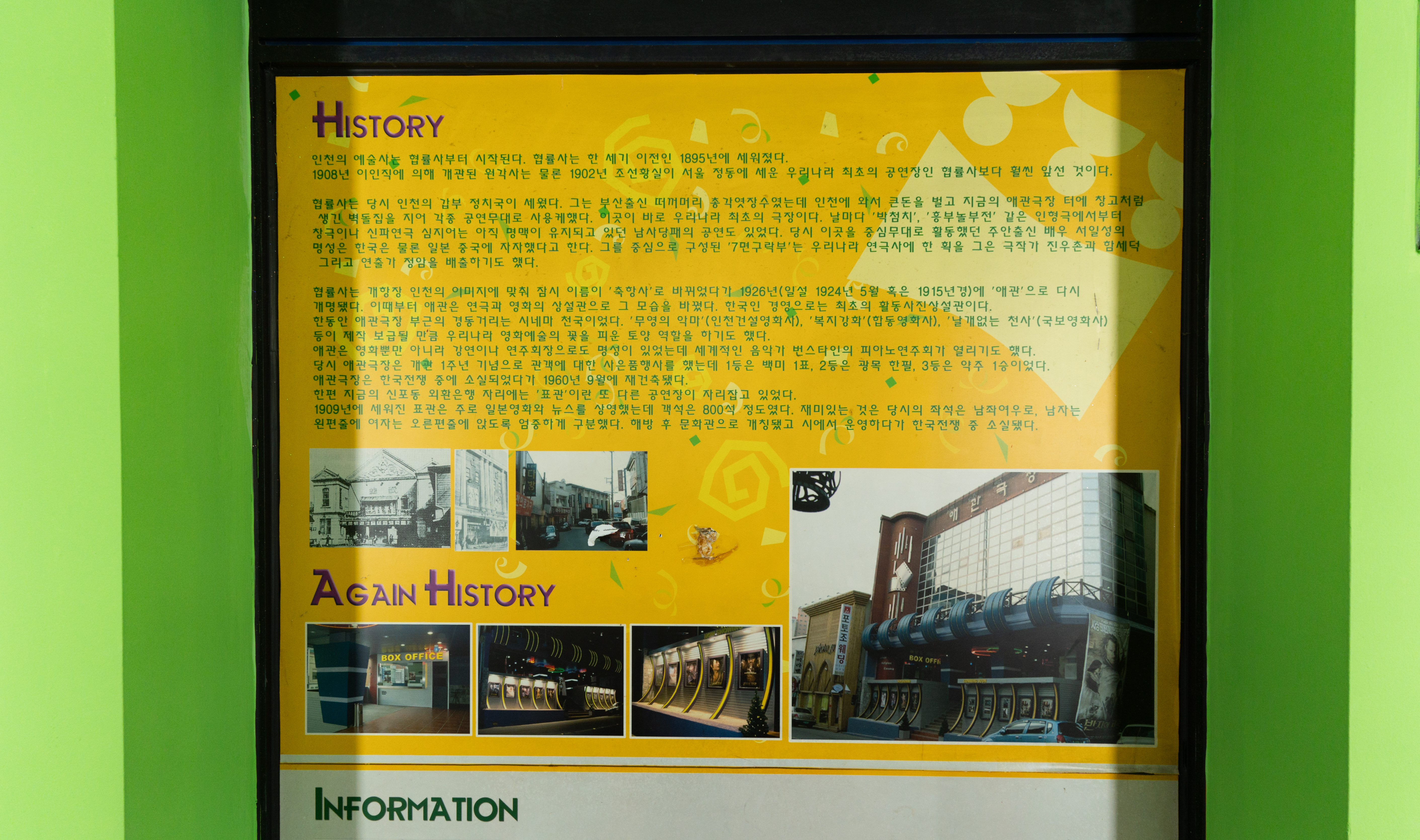영화관에 대한 정보들은 영화관 곳곳에 게시된 액자들을 통해 어렵지 않게 확인할 수 있었습니다. 애관극장은 1895년 협률사로 개관된 이후 여러 사연들을 담고 있는 건물이었습니다. 1911년 축항사로 이름이 바뀌었다가 1921년 애관으로 개명된 이후 애관극장은 한국전쟁 중 소실되었다가 1960년 9월 재건축되었다고 합니다. 이후 영화관으로 쭉 명맥을 이어오고 있었습니다.