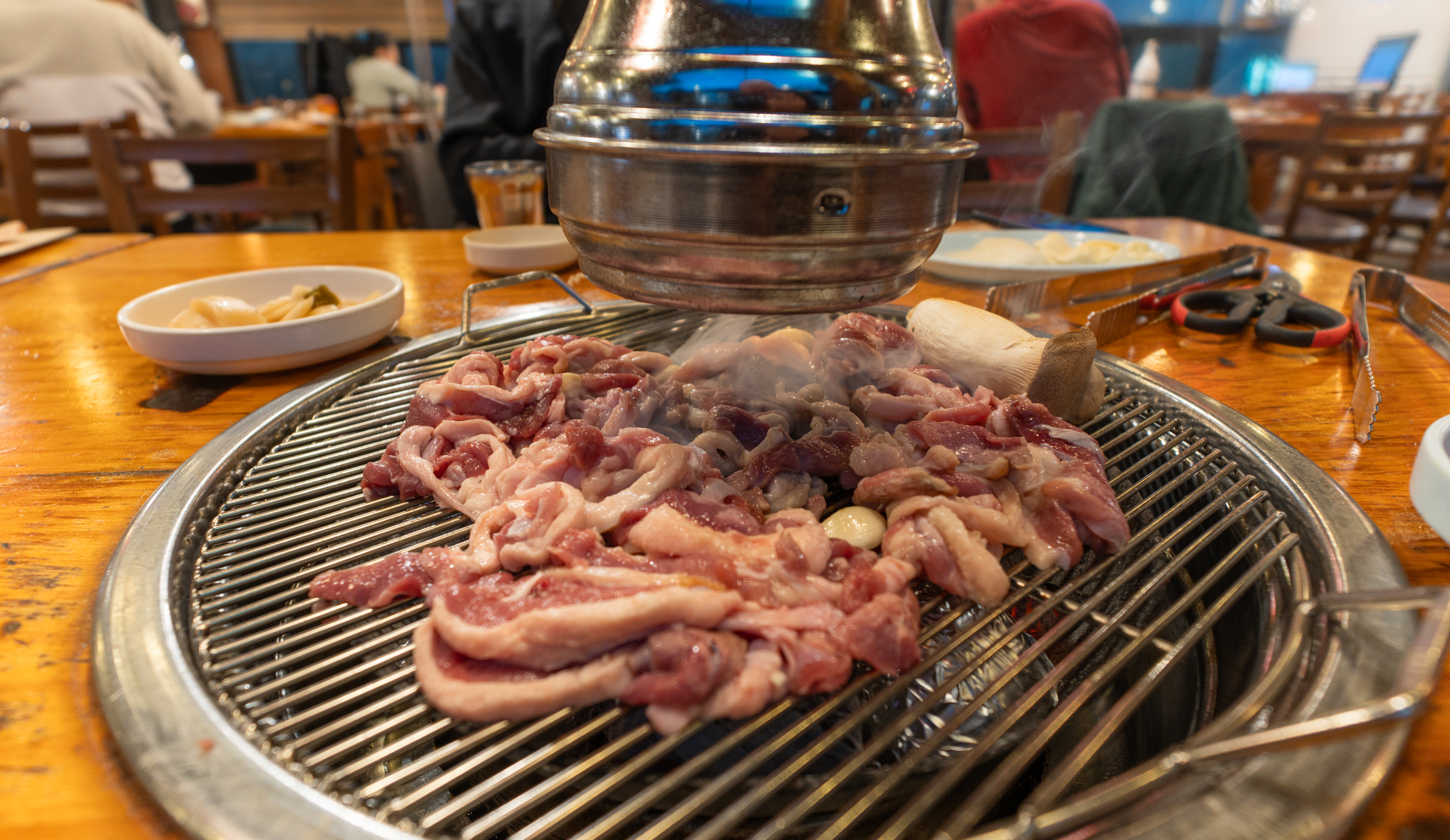 가나안덕의 오리고기를 주문하고 굽기 시작했습니다. 기본적으로 오리고기와 새송이버섯이 함께 제공되고 있으며, 반찬은 김치, 마늘, 양배추샐러드, 양파장아찌, 쌈채소, 쌈장이 나왔습니다. 추가 반찬은 셀프바에서 직접 가져다먹을 수 있었습니다.
