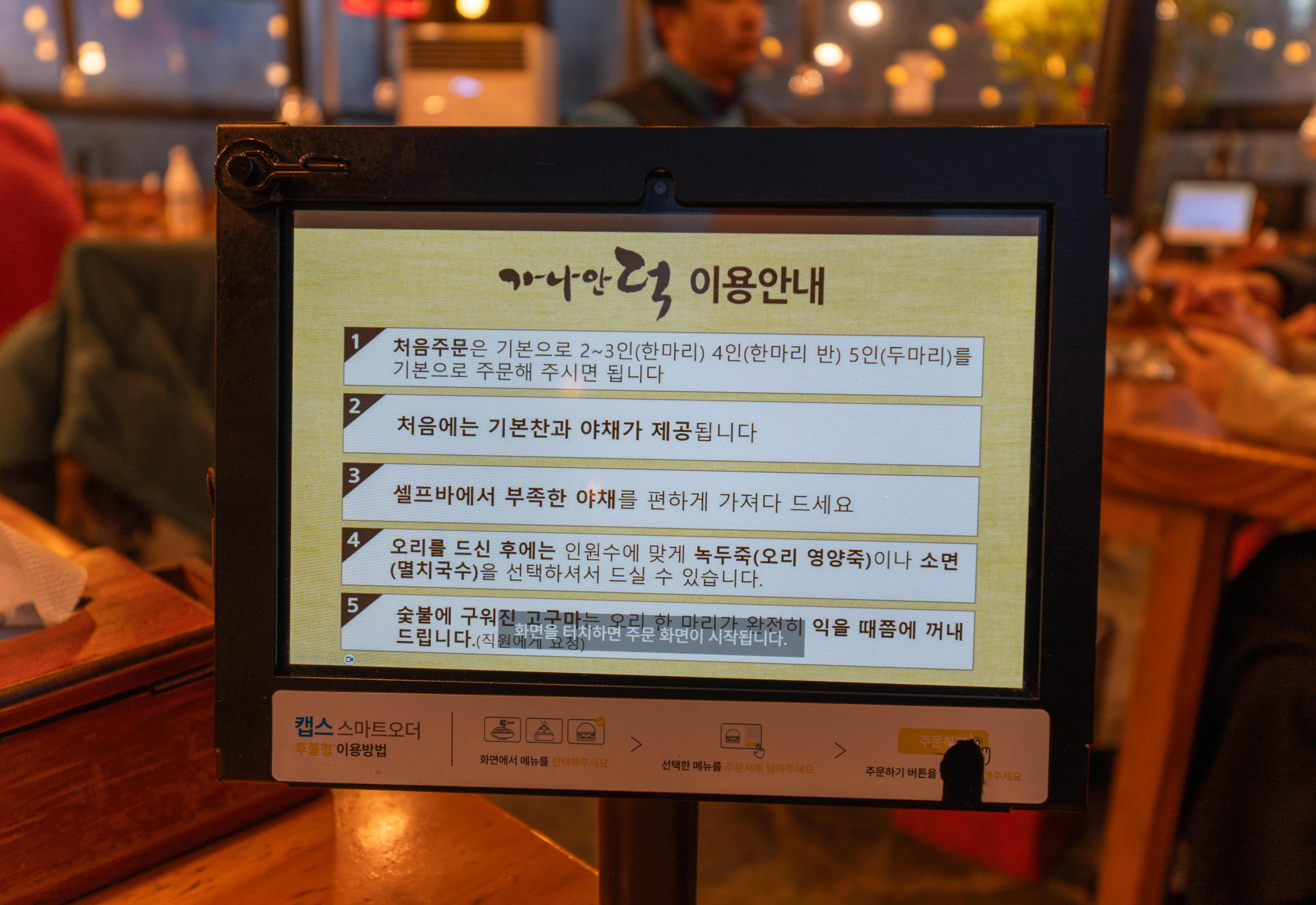 가나안덕의 메뉴는 이렇습니다. 가나안오리, 가나안훈제, 빨간양념오리, 된장뚝배기, 오리탕뚝배기가 있었습니다. 저희는 항상 기본 메뉴인 가나안오리를 즐겨 먹기 때문에 가나안오리 3마리를 주문했습니다. 메뉴 주문은 자리의 태블릿을 통해 주문하면 되었습니다.