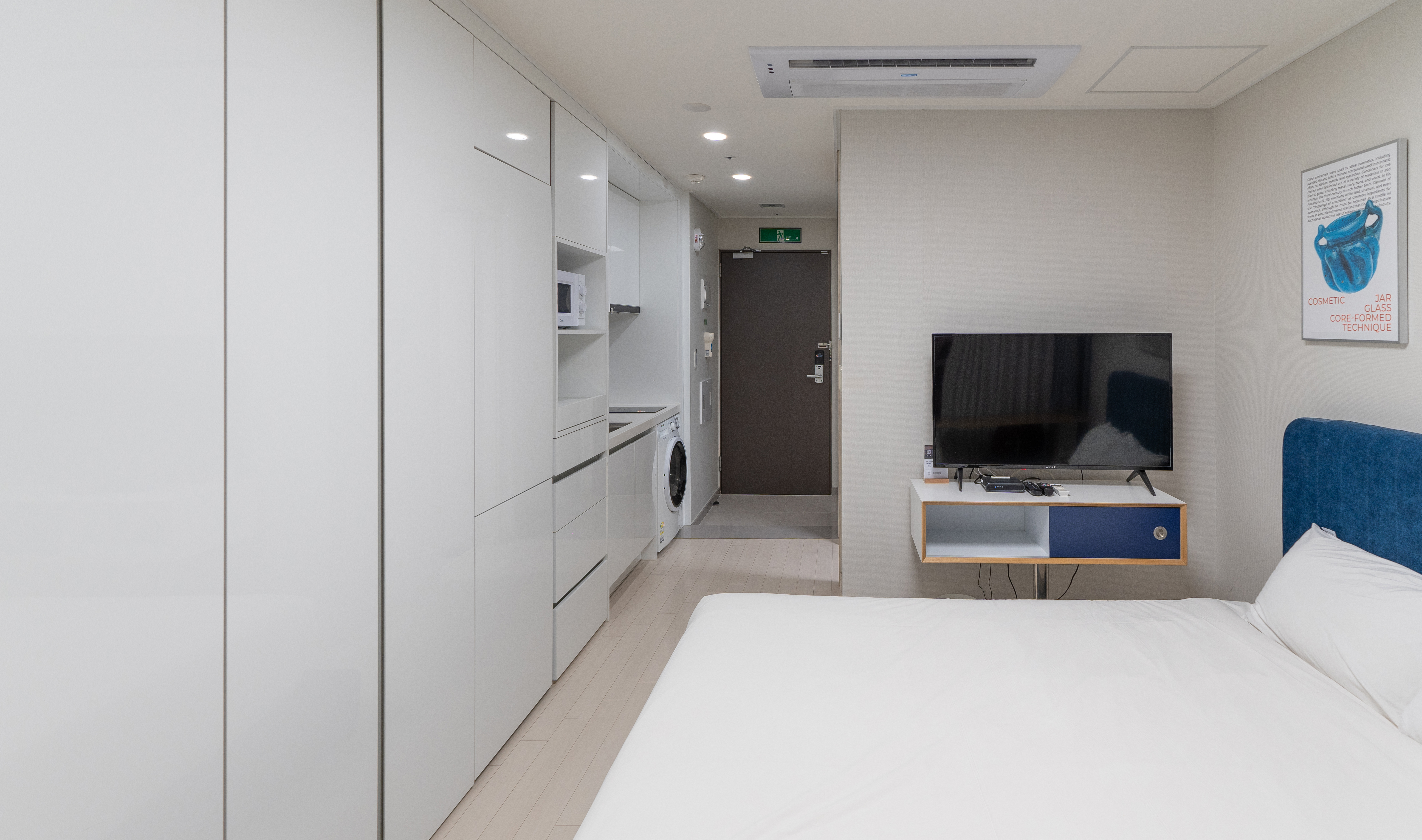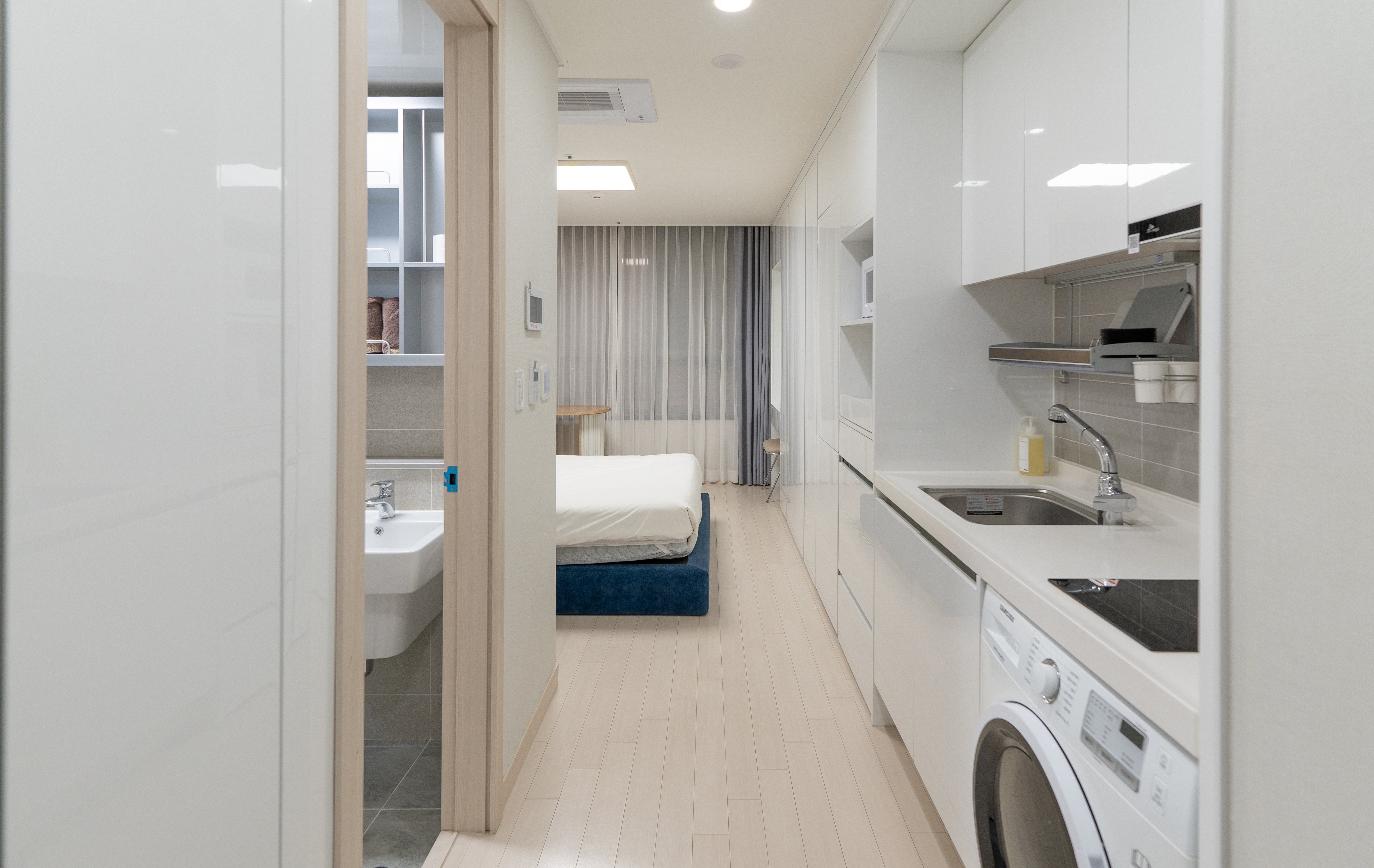 가전 및 가구는 화이트와 블랙으로 깔끔한 느낌이 있었고, 약간 인테리어 견본 하우스 처럼 데스크나 멀티탭마저도 약간 고급스러운 느낌이 있었습니다. 간이 주방에도 간단히 요리하거나 설거지할 수 있도록 되어있었고, 세탁기에는 건조기능까지 달려있어 간단한 세탁이 가능했습니다.