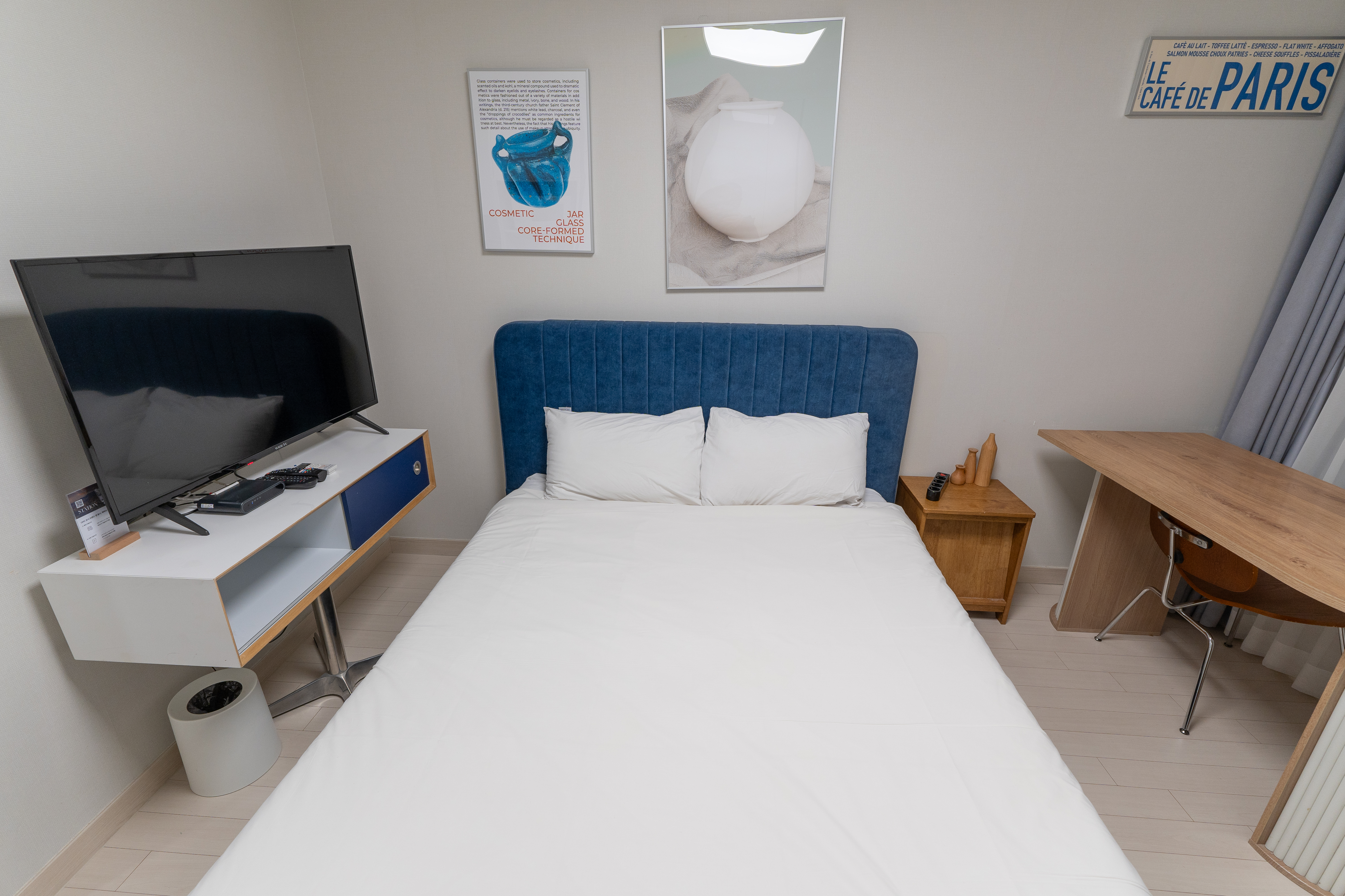UH FLAT 더송도의 침실의 모습은 위와 같습니다. 이곳은 타 레지던스 대비 살짝 협소한 느낌이 있었지만, 나름 잘 꾸며져 있고, 저 혼자 이용하기에 크게 불편함은 없었습니다. 보통 침대에 누웠을 때 정면에 TV가 설치되어 있는데, 이곳은 이상하게도 침대 옆으로 작은 TV가 놓여있었다는 점이 있었습니다.