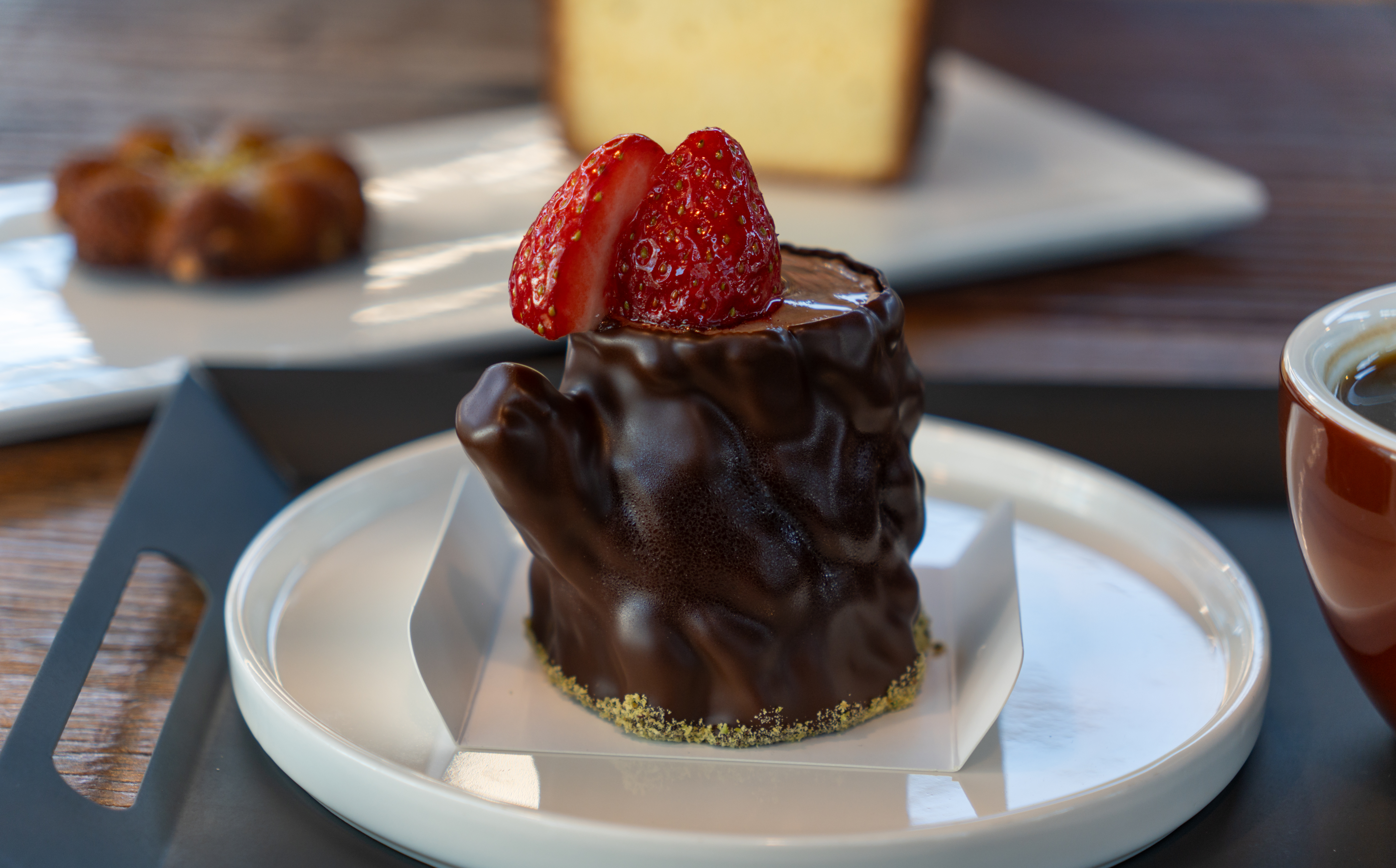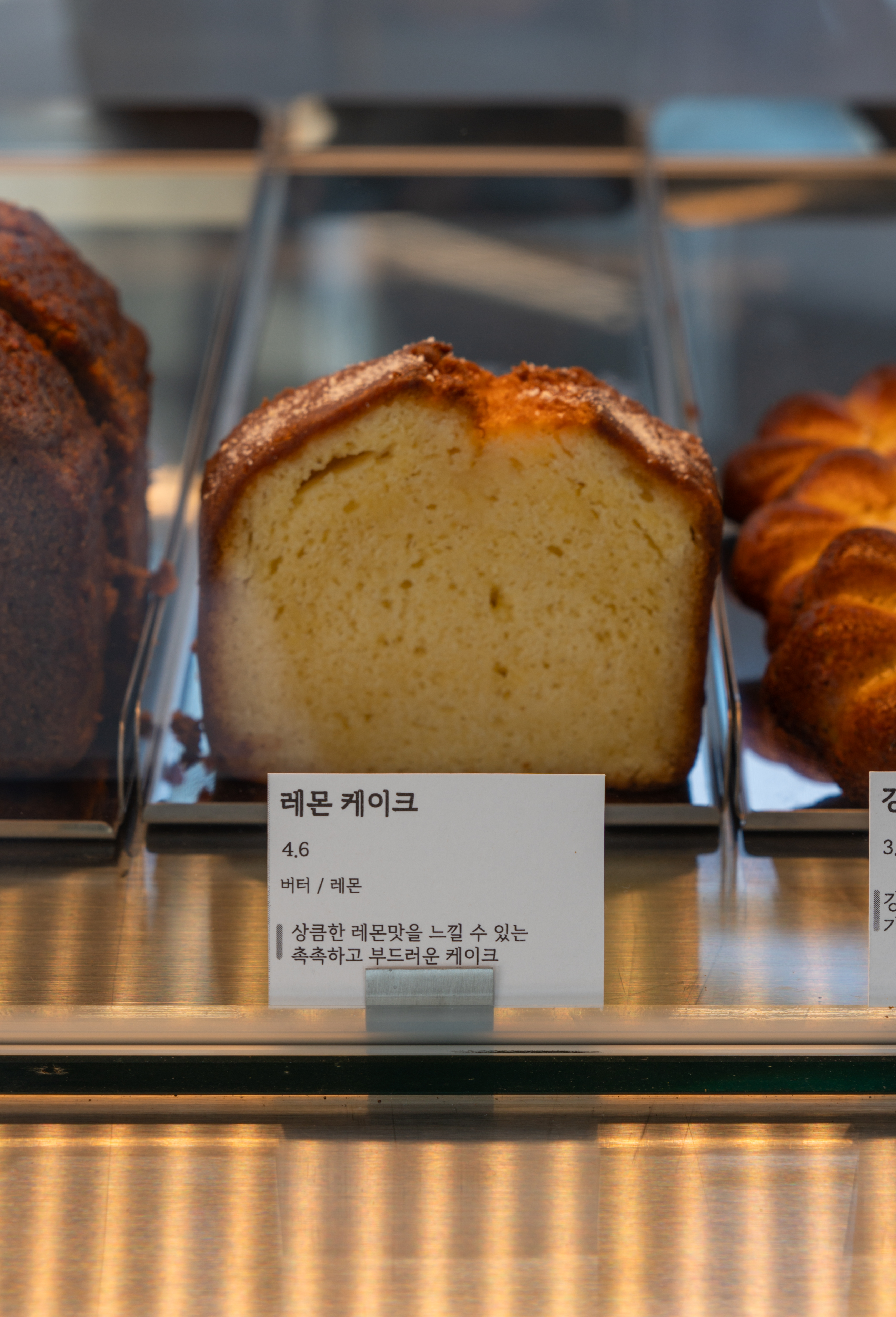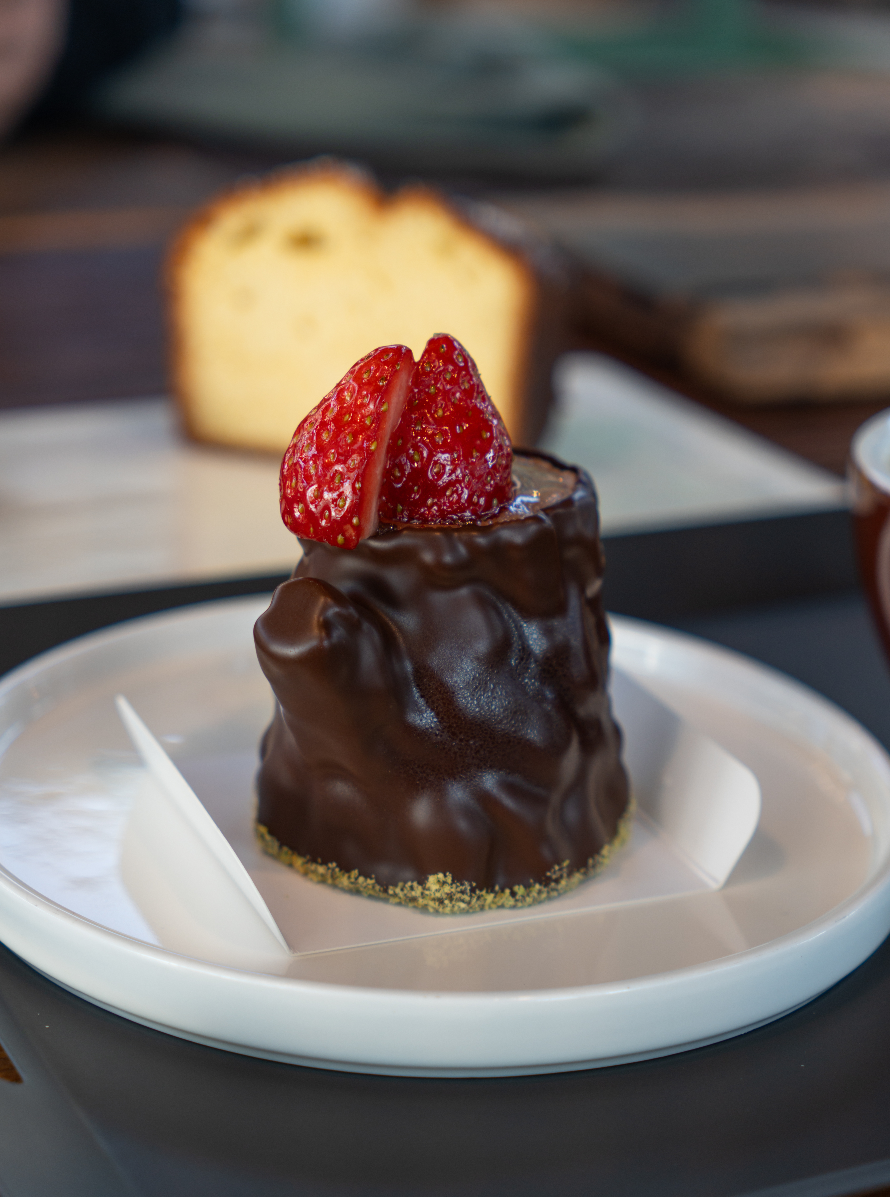 시그니처 메뉴 딸기나무와 피스타치오 오렌지 휘낭시에 그리고 레몬 케이크의 모습입니다. 상큼한 맛의 레몬케이크에 꾸덕한 식감(?)이 있는 피스타치오 오렌지 휘낭시에도 인상적이었지만, 사실 저는 이곳에 방문하기 전 딸기나무가 가장 궁금했었는데, 딸기나무는 부드러운 밀크초콜릿 무스에 상큼한 딸기소스의 조화가 이루어지는 메뉴라고 합니다.