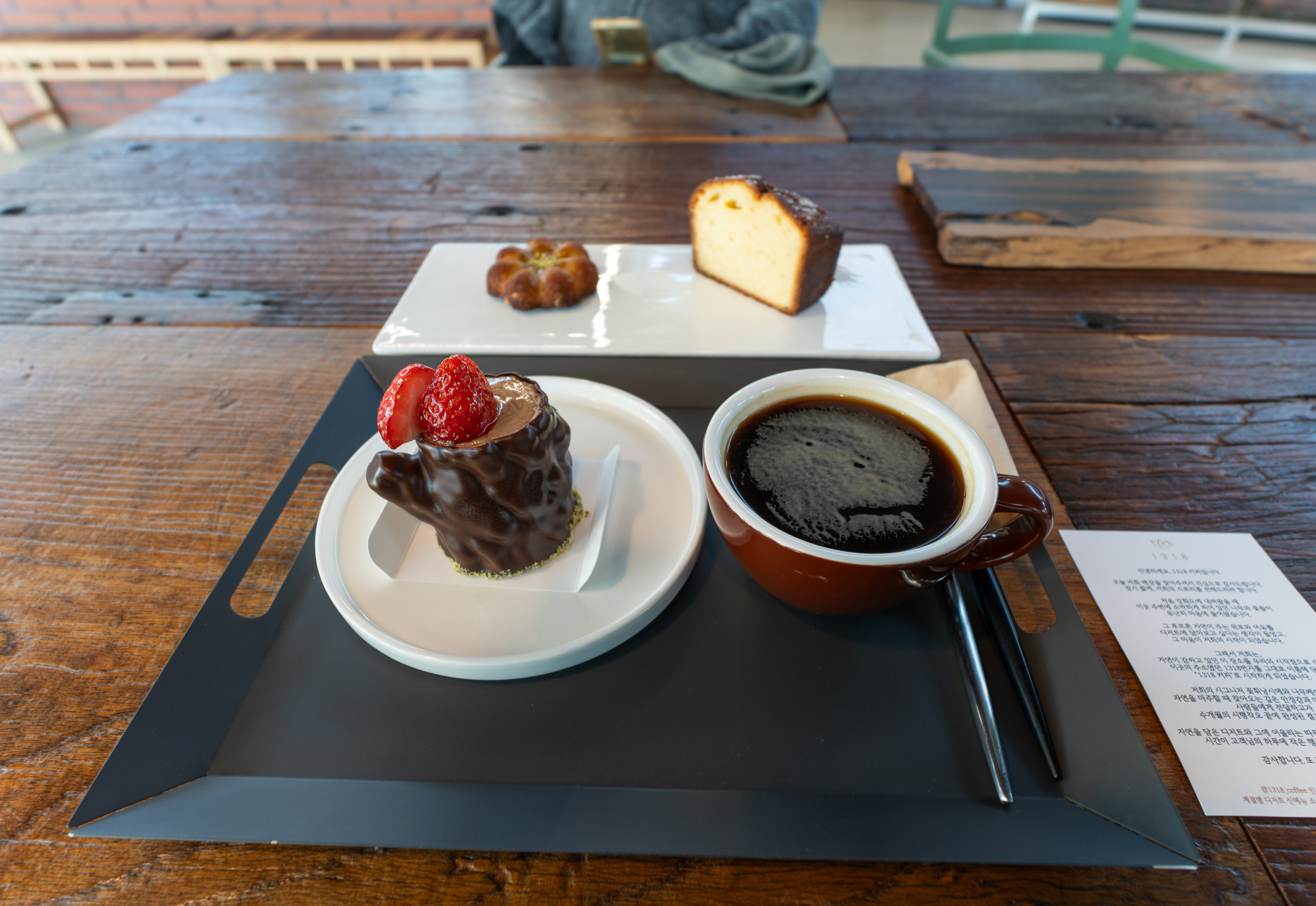 저는 황진 작가의 강화도 베이커리 카페 1318커피의 시그니처 메뉴인 피스타치오오렌지휘낭시에, 레몬케이크, 딸기나무 디저트와 디카페인 아메리카노를 주문해서 먹었습니다. 그럼 디저트들도 자세히 살펴보실까요?