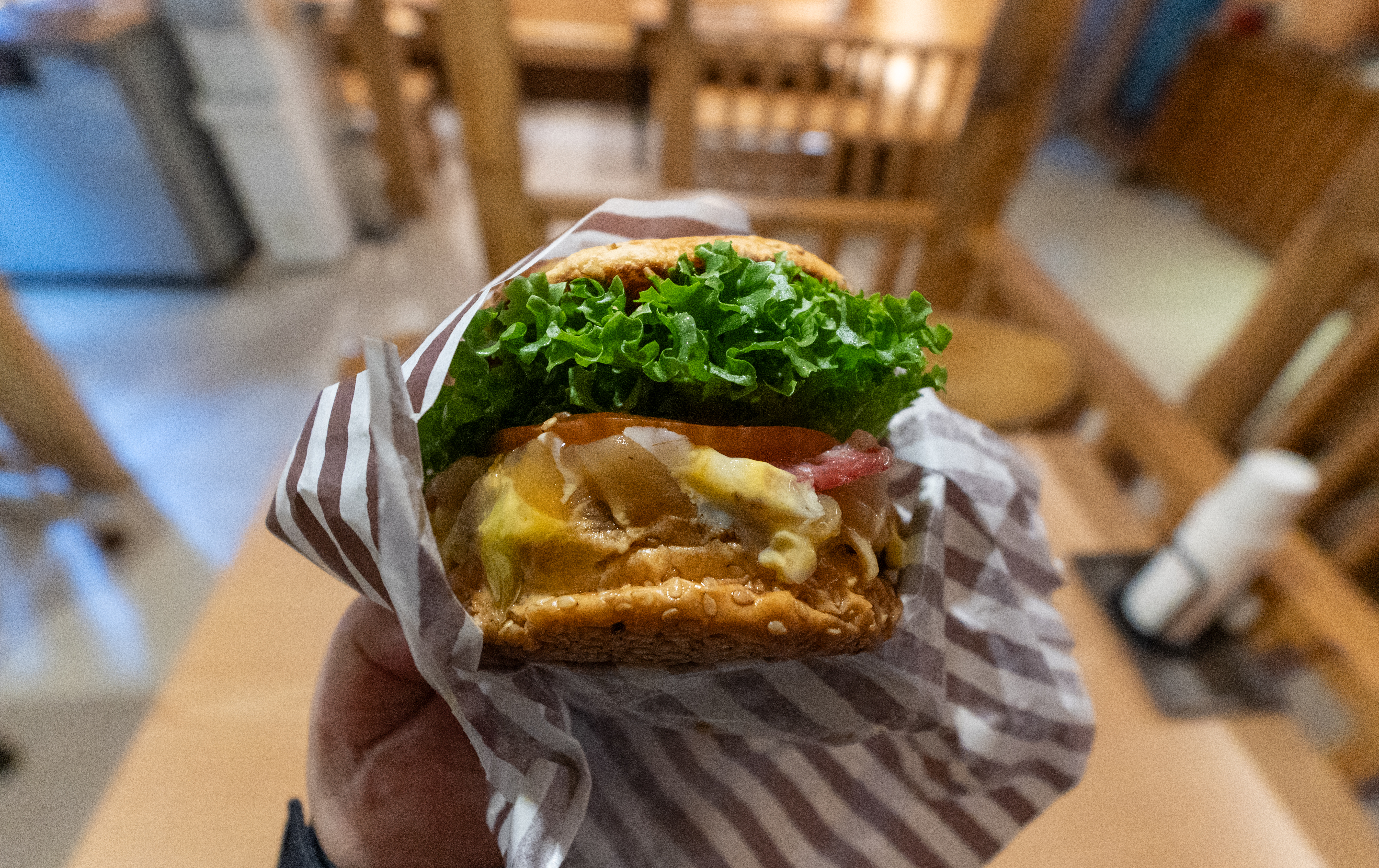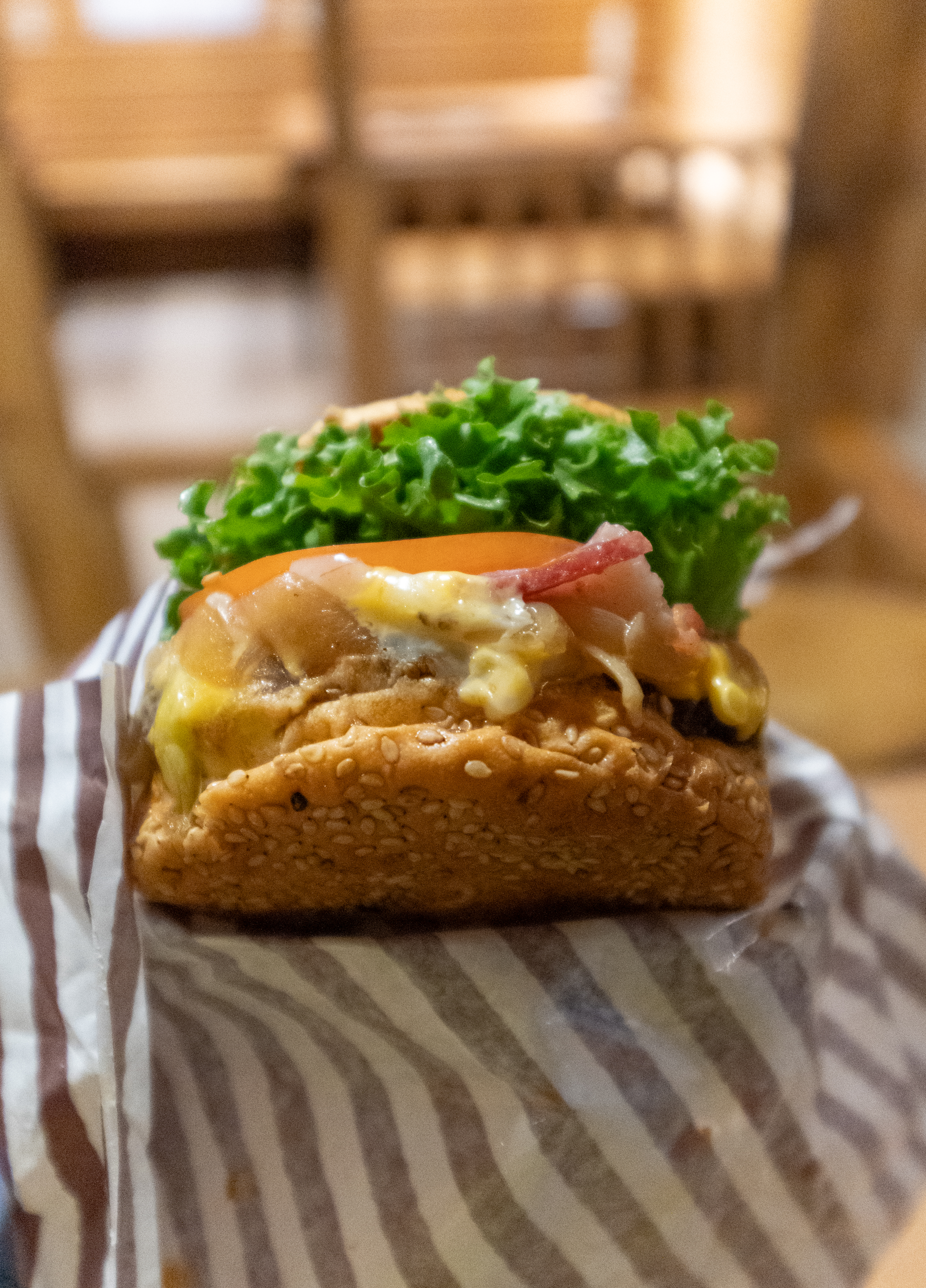 강화도 온수리 버거의신 가게의 버거신 버거 모습입니다. 저번에 봤던 양상추에서 이번에 살짝 종류가 바뀐 듯했고, 참깨빵에 치즈, 패티, 구운양파, 베이컨, 토마토같은 나머지 구성은 동일했습니다. 햄버거는 역시나 맥도날드 1955 버거 느낌의 스모키 한 맛의 햄버거였습니다. 맛도 좋았고요.